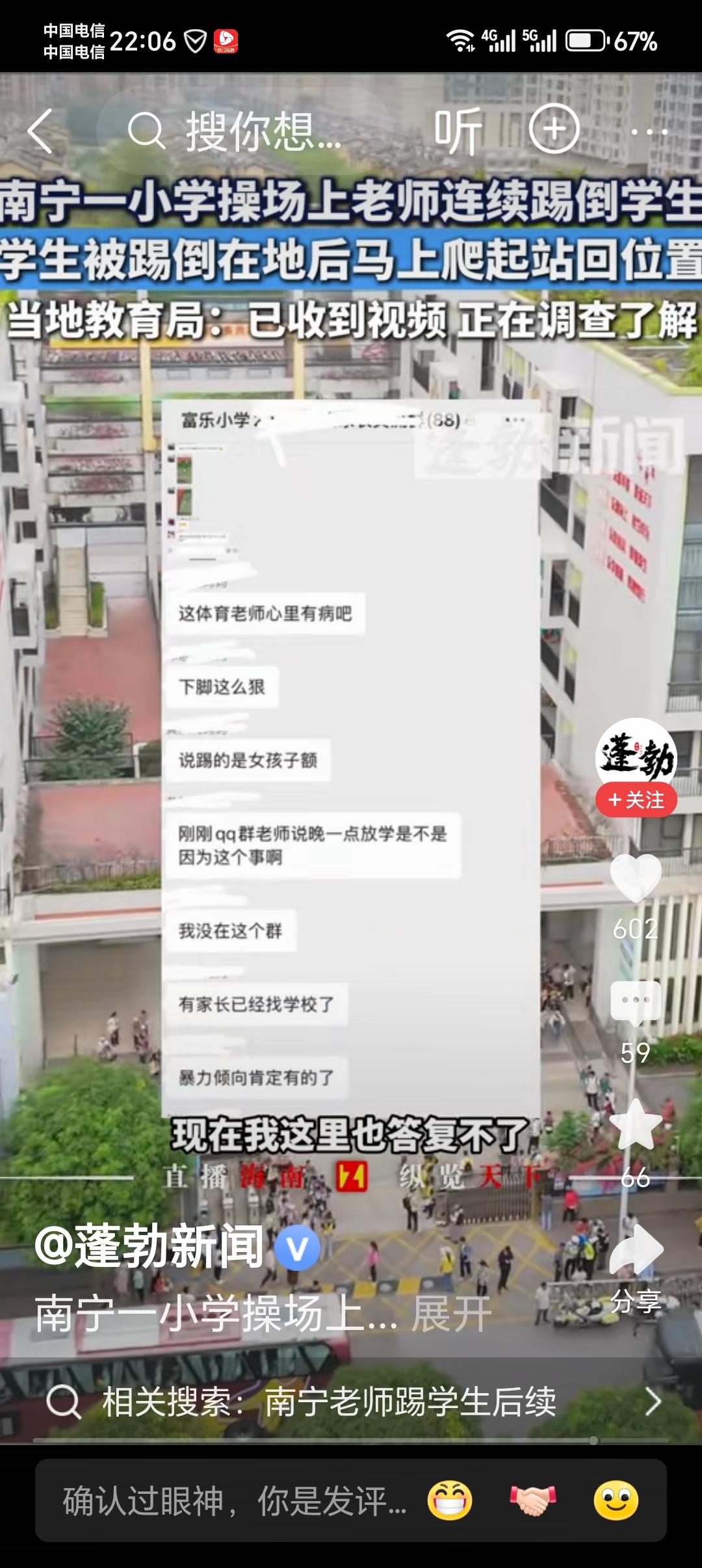 南宁小学教师飞踢学生!监控曝光后,家长怒问:孩子的校园谁来守护? 2025年10月10日,本该充满欢声笑语的校园大课间,竟成了三名小学生的噩梦时刻。南宁富乐小学外聘教师蒙某在维持秩序时突然失控,连续飞踢两名学生,又猛推另一个孩子,监控画面里,穿粉色裙子的小女孩被踢得踉跄后退,戴眼镜的小男孩险些撞上栏杆,这不仅是体罚,更是对师德底线的公然践踏 现场其他学生吓得呆立原地,事后有孩子偷偷告诉妈妈,现在看到校服都会发抖,这份心理创伤,岂是一句道歉能够抹去? 江南区教育局连夜通报,校医检查确认三名学生身体无大碍,心理教师已介入疏导,涉事教师蒙某向家长道歉,学校火速启动解聘程序,但家长群的怒火早已燎原:这次是踢推,下次会是什么?外聘教师的管理漏洞必须堵死!有家长哽咽道出所有人心声:送孩子上学,不是送来当出气筒的! 最新进展 江南区全区紧急开展师德师风整顿 所有外聘教师重新资格审查 涉事学校校长公开检讨 教育局设立24小时监督热线 小编呼吁 教育不能成为暴力的遮羞布。今天你踢的是孩子,明天毁的是自己的未来。建立教师黑名单制度刻不容缓,让每个孩子都能在阳光下奔跑。 您认为该如何杜绝此类事件? 是否支持终身禁入机制? 评论区需要您的真知灼见! 教师踢学生师德红线 校园安全 南宁教育 (本文综合教育局通报及家长反馈,持续跟踪请点关注)