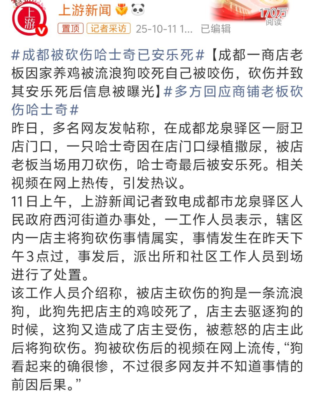 成都被砍伤哈士奇已安乐死