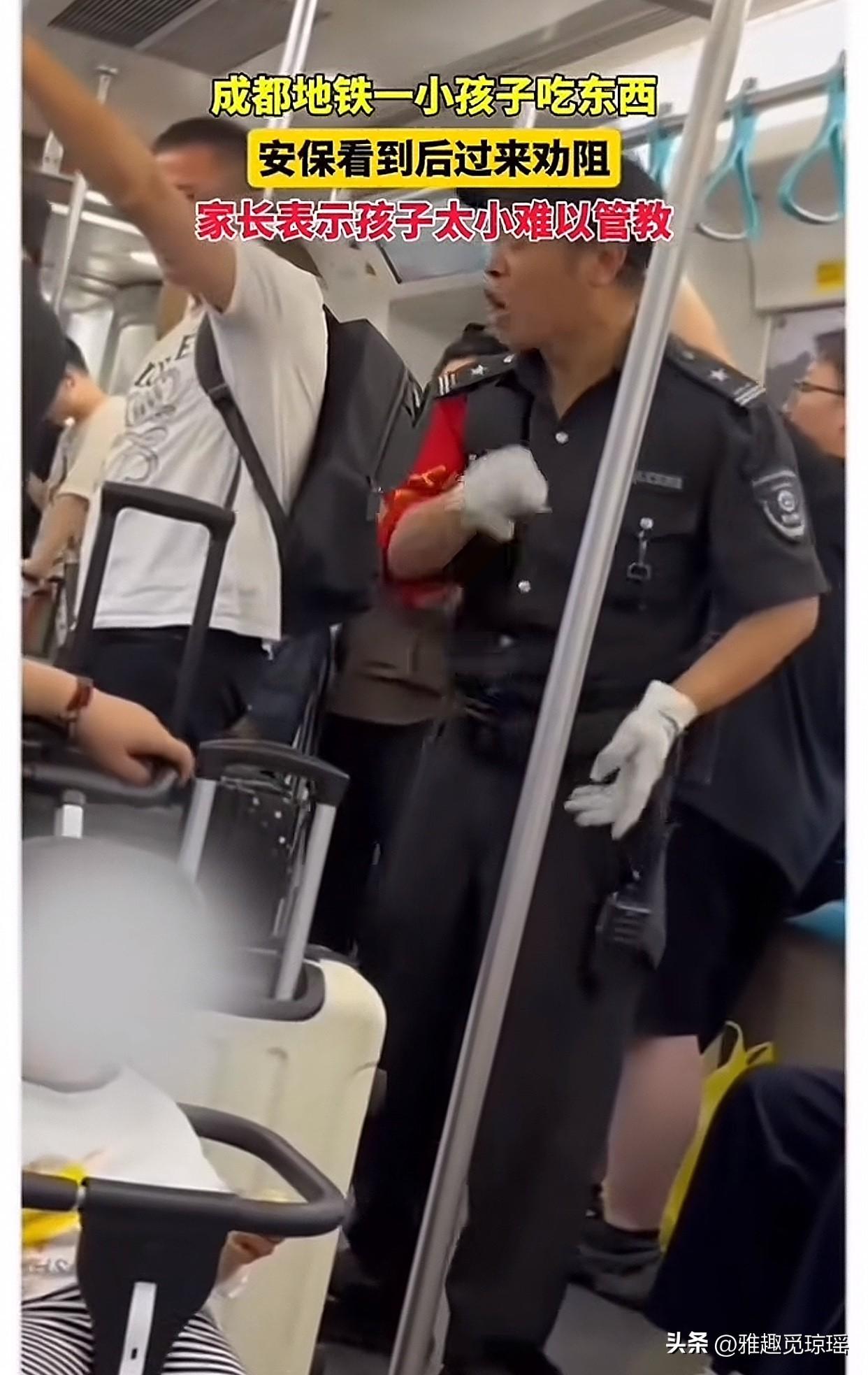 “真是无语死了!”成都地铁上,一小孩子在车上吃东西,碎屑掉了一地。安保员过来提醒