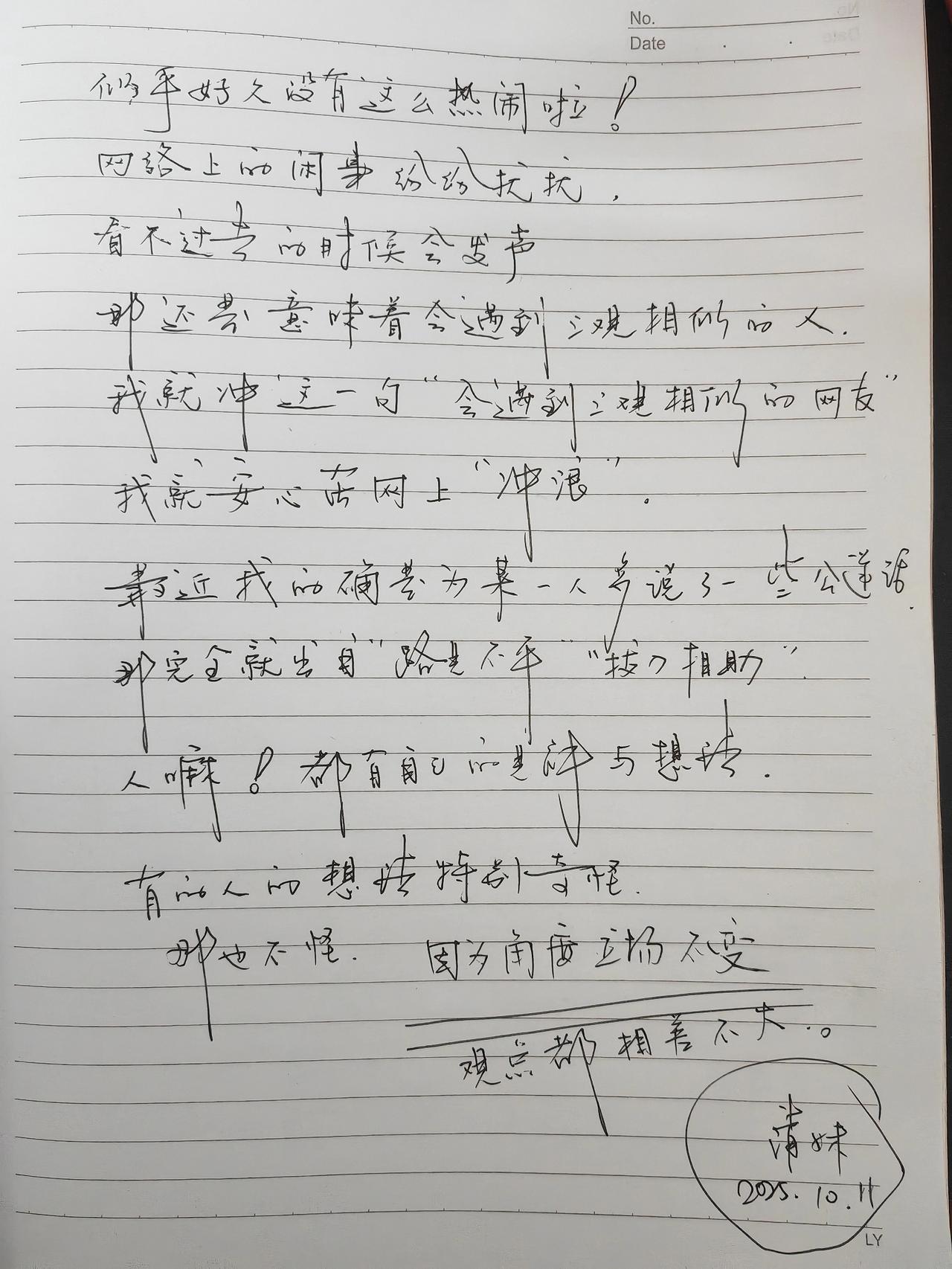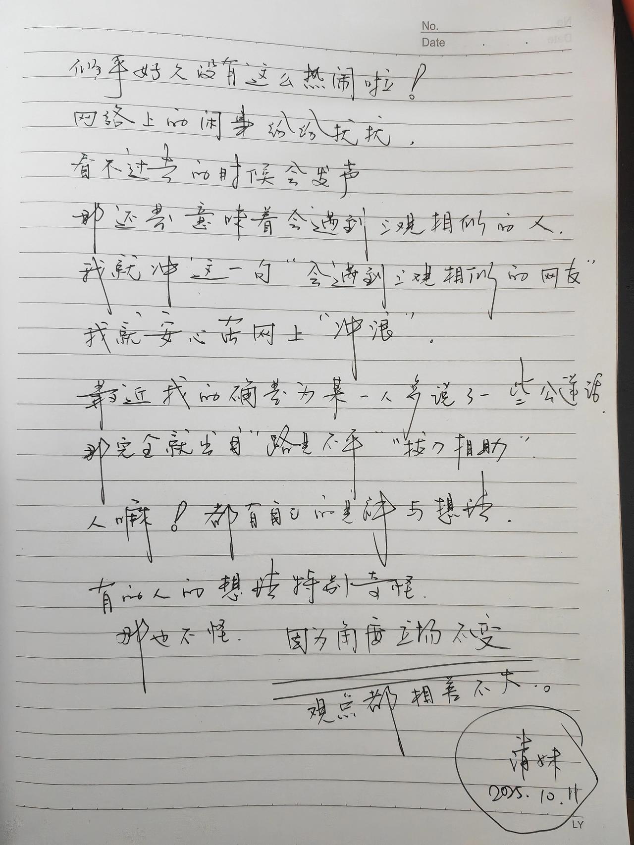 我就是我,不一样的烟火。 观点,观点的碰撞。 天南地北, 五湖四海, 谁能保证别人正是我, 谁又能证明我就是别人, 观点相同如酒逢知己千杯少, 话不投机半句多。 该笑就笑, 少哭点吧! 人生没有什么大不了。 洒脱一点吧! 我黄清妹从老黄那里借了一个姓。 做了一个我。[微笑][微笑][微笑] 我为何是我自己 我 自我我 我并非我 我是自媒体 我 我 今晚上我就是我 个人表达自由 这就是我人生 我是宇宙的存在 生活由我定义 我本是个人 我是谁我是哪 我也一样洒脱