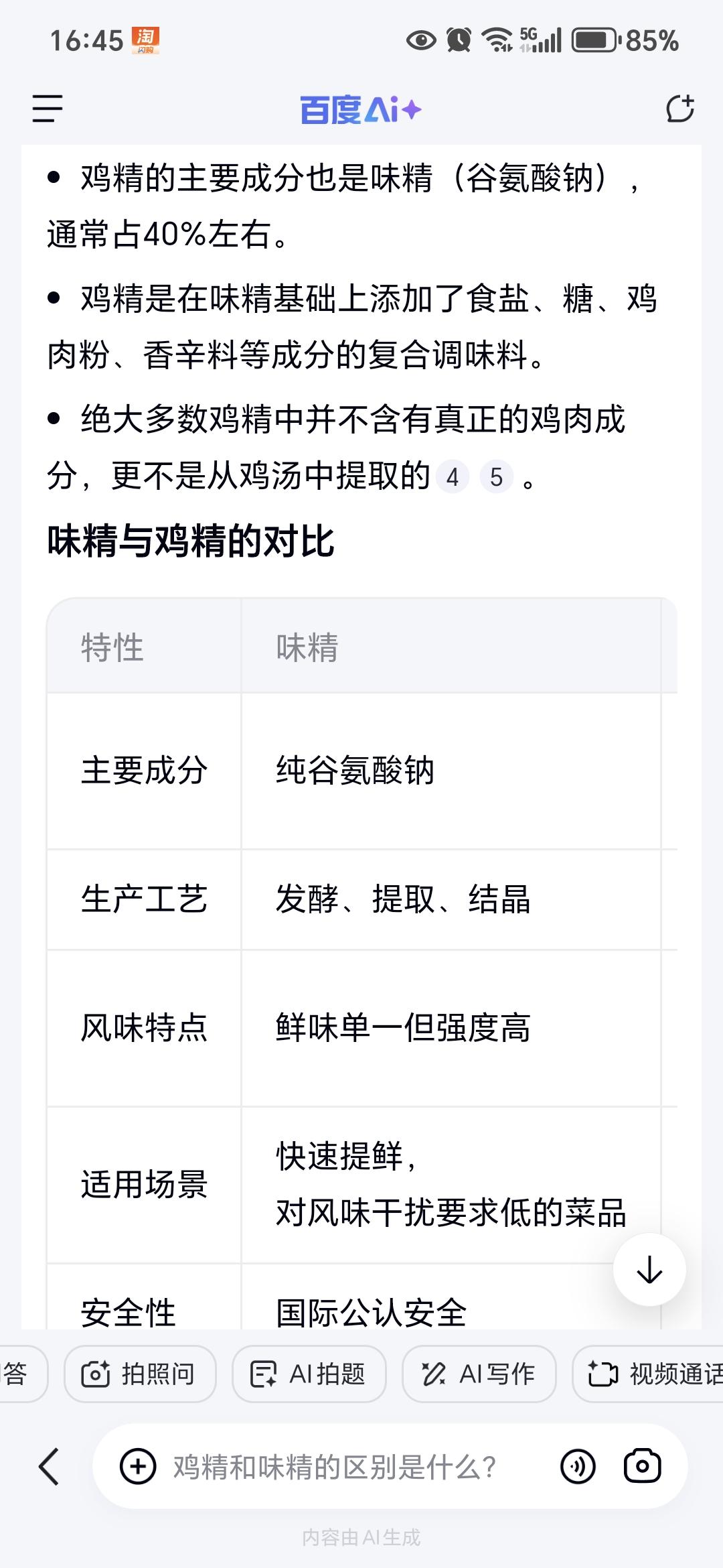 你家做菜放鸡精,还是味精? 一直流传着味精吃多了会致癌,掉头发,中毒,杀精。这谣言一出大家都改为吃鸡精,那你们看过鸡精的配料表吗?鸡精的主要成分也是味精(谷氨酸钠), 通常占40%左右。 ·鸡精是在味精基础上添加了食盐、糖、鸡肉粉、香辛料等成分的复合调味料。 ·绝大多数鸡精中并不含有真正的鸡肉成分,更不是从鸡汤中提取的[呲牙]。谣言真可怕! 味精由王米等粮食为原料通过发酵、提取、精制而成主要成分是谷氨酸钠,无毒。 无彭国际权威机构对谷氨酸钠的安全性进行了全面评估: 世界卫生组织(WHO)确认味精在常规食用量下安全 美国食品药品监督管理局(FDA)将味精列为"公认安全物质"(GRAS) 国际食品添加剂委员会(JECFA)将味精安全摄入量定为"无需限。 你们是平时炒菜会放味精吗?你们是放鸡精还是味精?
