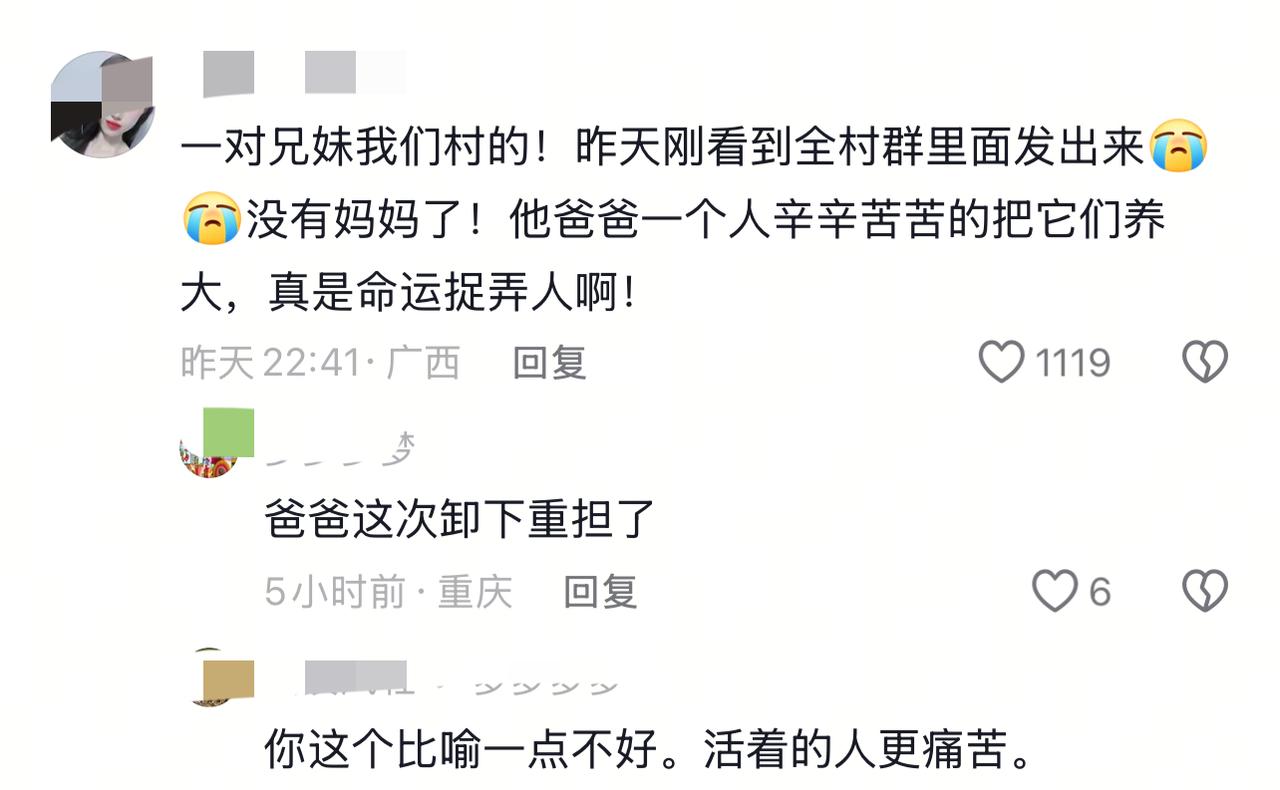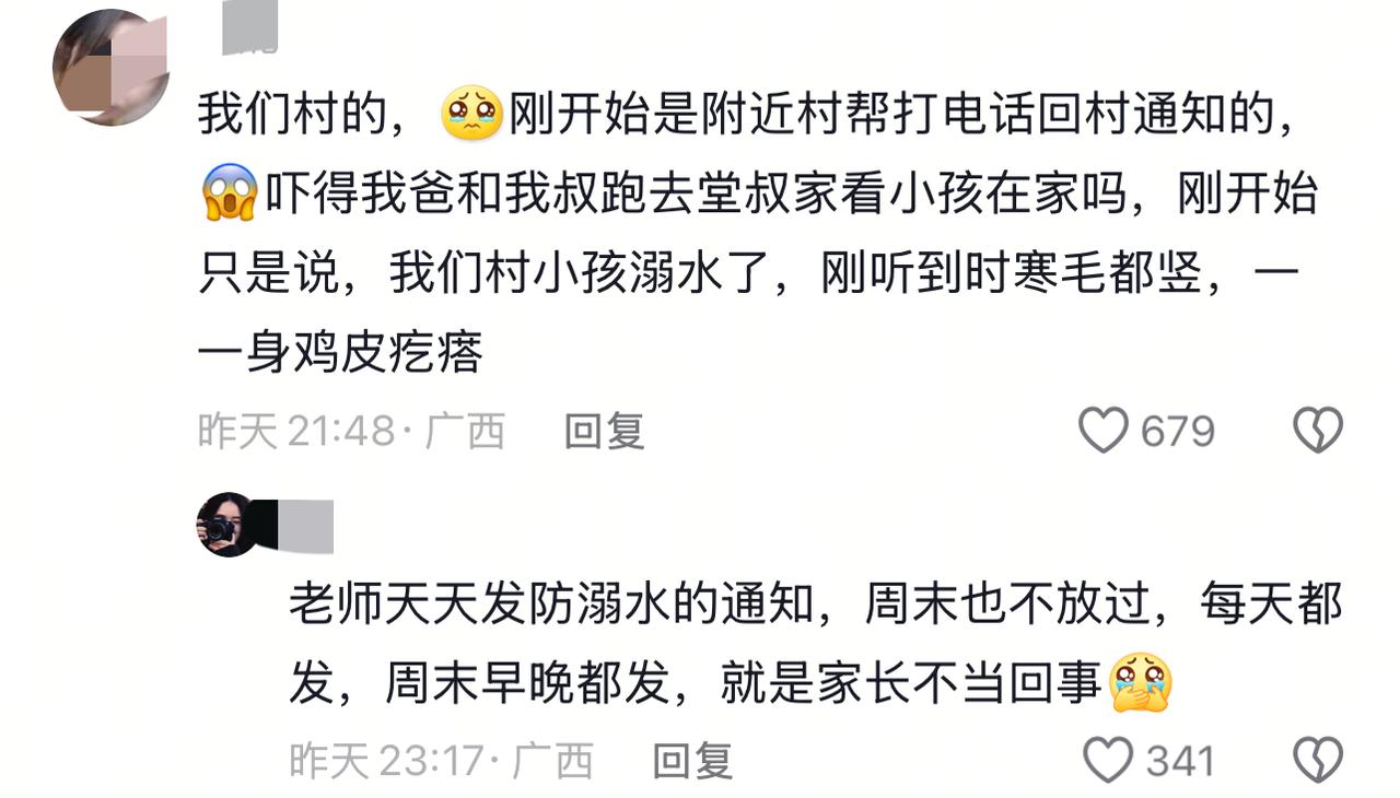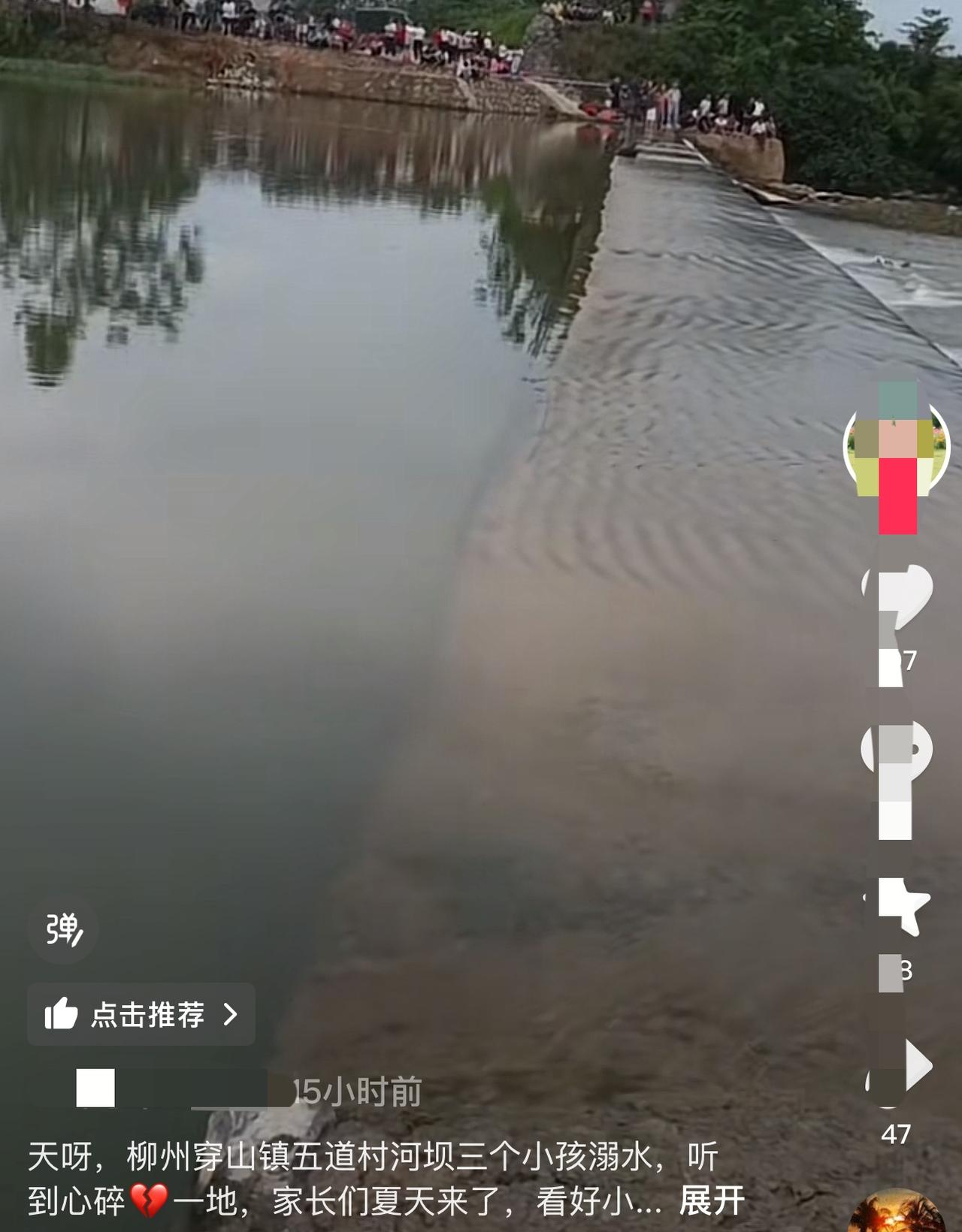 年年讲防溺水,就是有家长不重视!6月9日晚,广西柳州市柳江区发布一则通报,又有悲剧发生,这次是三个孩子。 6月8日,恰逢周末,来宾市兴宾区大湾镇的3名儿童结伴游玩,在没有监护人陪同的情况下来到柳州市柳江区穿山镇五道村,在徒步通过两地交界穿山河的一处滚水坝时不慎落水失联。 接到儿童落水失联的消息后,当地立即开展救援工作,但不幸的是,三名儿童全被打捞上岸,均不幸遇难。 通报中没有写孩子们的年龄,但用的儿童一词,想必年龄不会太大,有当地网友透露,其中有一对是兄妹,没有妈妈了,爸爸一人把他们拉扯大,如今却发生这种事,太悲惨。 真是太可怜了,厄运专挑苦命人,想必爸爸整天忙于生计,也没太多时间陪伴两个孩子,可反过来想想,这么辛苦不就是为了孩子吗,现在孩子没了,其他的毫无意义。 一到周末和假期,老师就发防溺水的通知,天天提醒教育,就是有不听话的孩子,不重视的家长,唉,太可惜了。