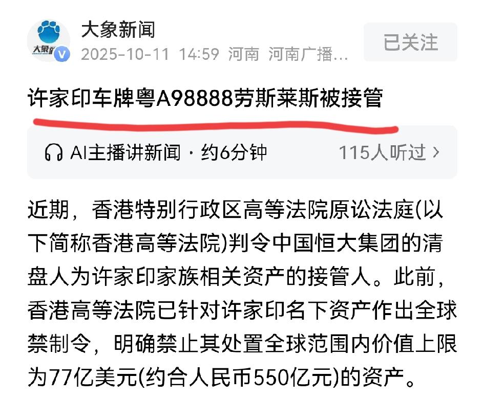 这一回, 许家印连自己的车牌都保不住了, 因为他的车牌号本身就比任何一辆车的价格