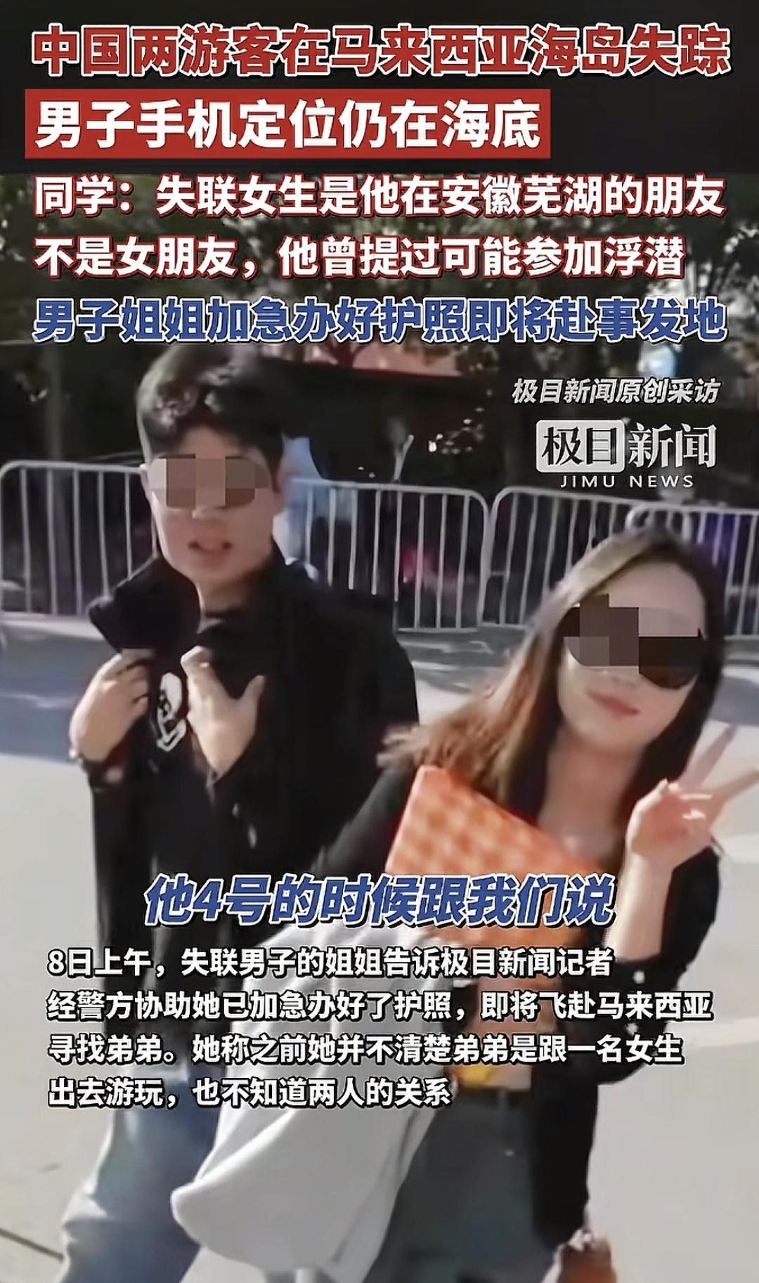 在马来失联的两名中国游客 男孩28岁,山东威海人,在安徽芜湖工作,女孩安徽芜湖本地人,两人均在入住度假酒店时失踪,4号的时候,男孩还联系过自己的姐姐,说自己可能去美人鱼岛,随后失联。 目前双方家庭都在想办法赶往事发地,家人透露一男一女只是好朋友,并不是情侣,只因热爱旅游才相约出游。 不过男孩估计凶多吉少了,朋友透露,手机电话打不通,最后一次信号定位在海域深处,有可能是参加浮漂出事了。男孩的两只耳机,一只定位在市内,一只则停留在海上。 虽然当地警方出警捞手机了,但大海里捞人只能碰碰运气了,尤其是在国外,他们警察的办事流程和国内还是有区别的,所以呀,没事就不要往国外跑,还是国内安全 不过也可能是离岸流卷走了?还是潜水出问题了?不管怎样,在海边旅游要注意安全,也希望这两人平安。马来西亚遇难