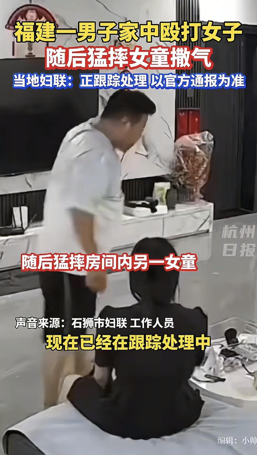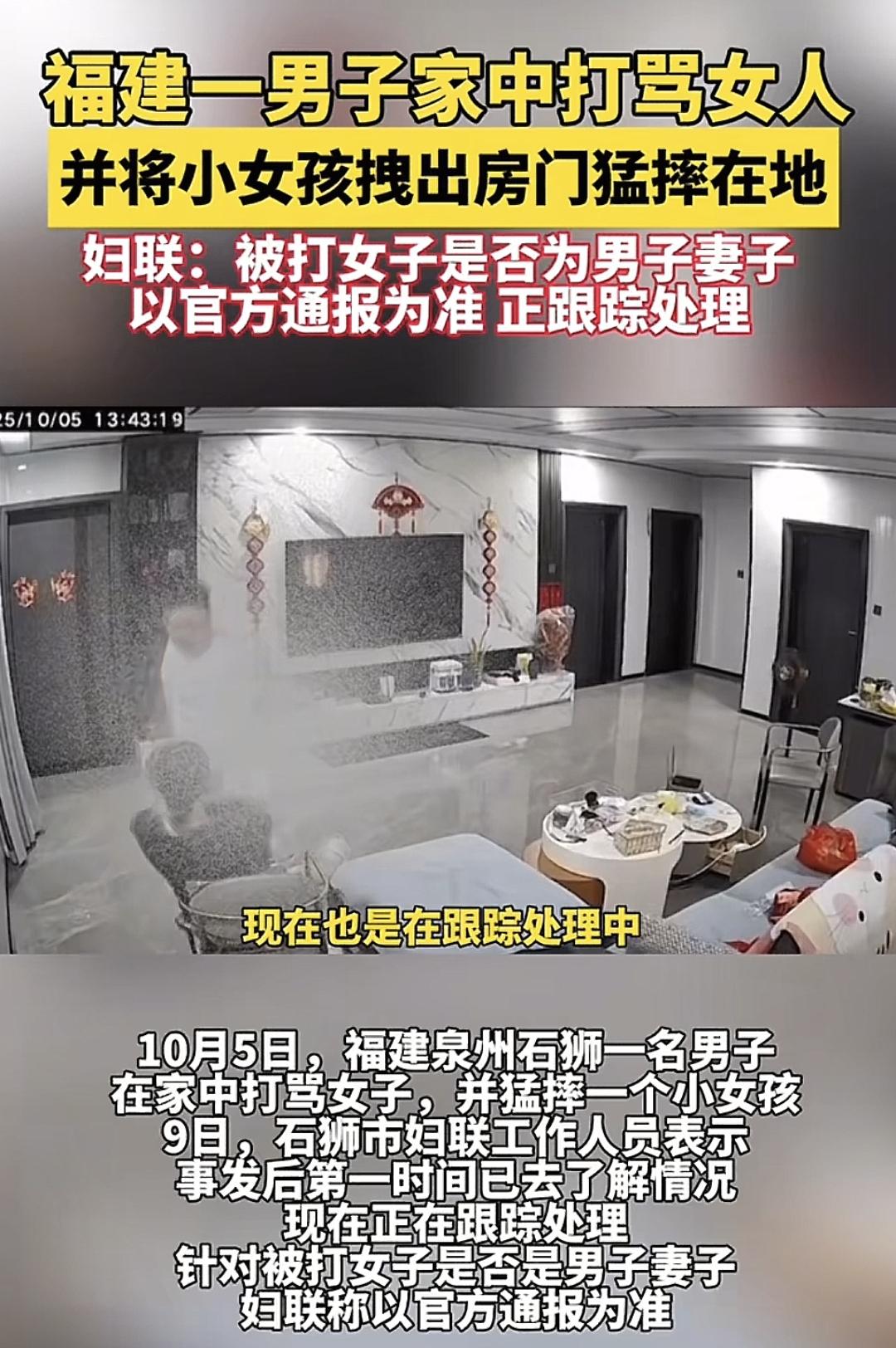 石狮男子这下全国人都认识你了 心狠到连孩子都不放过,9岁小女孩从房间内拖出来扔地上,后脑勺重重着地,孩子躺在地上一动不动,这还不停手,继续殴打孩子母亲,官方还说是不是他老婆还需要等后续通报,蹲了几天了,也没看到后续发出来,说实话要真不是他老婆还好一些,不需要顾及什么感情,人身伤害罪直接这暴力男送进去! 也不知道被摔的小女孩现在怎么样了,有网友说“那个可怜的女孩已经没了”,也有人说“脑震荡住院去了”,看着怪心疼得,希望官方早点分享下孩子的状况。 这事给再婚的女性提了个醒,要真是“二婚”还是不要带着自己的孩子嫁进男方家,要后爸把你的娃当成亲生的还是有难度的。 你们怎么看待再婚这个事儿呢?评论区聊聊殴打事件 殴打小孩 未成年家暴致死 女子打人