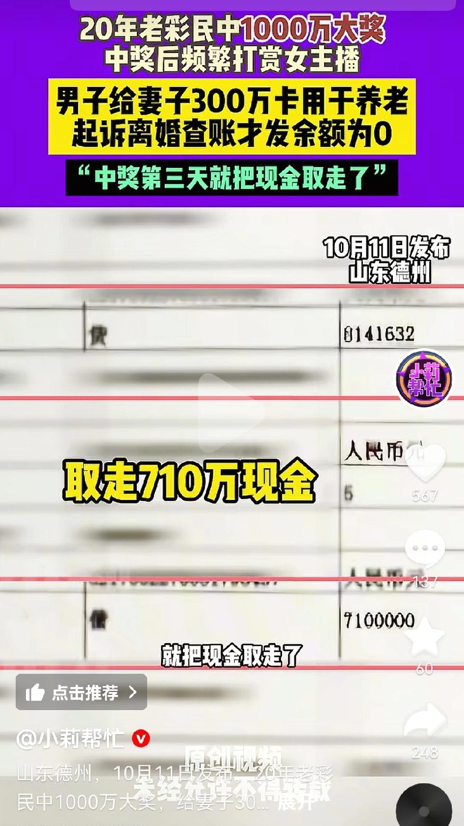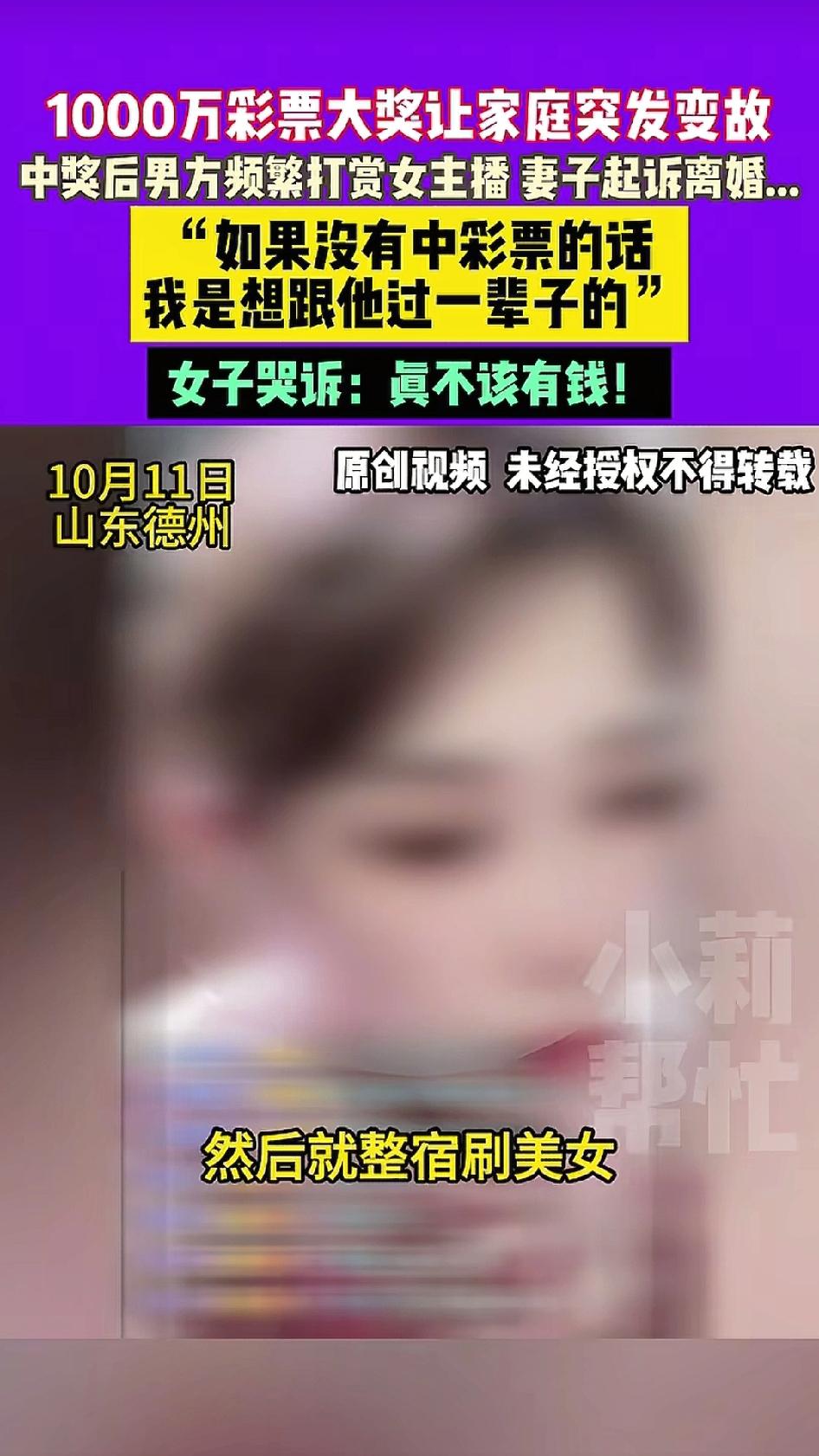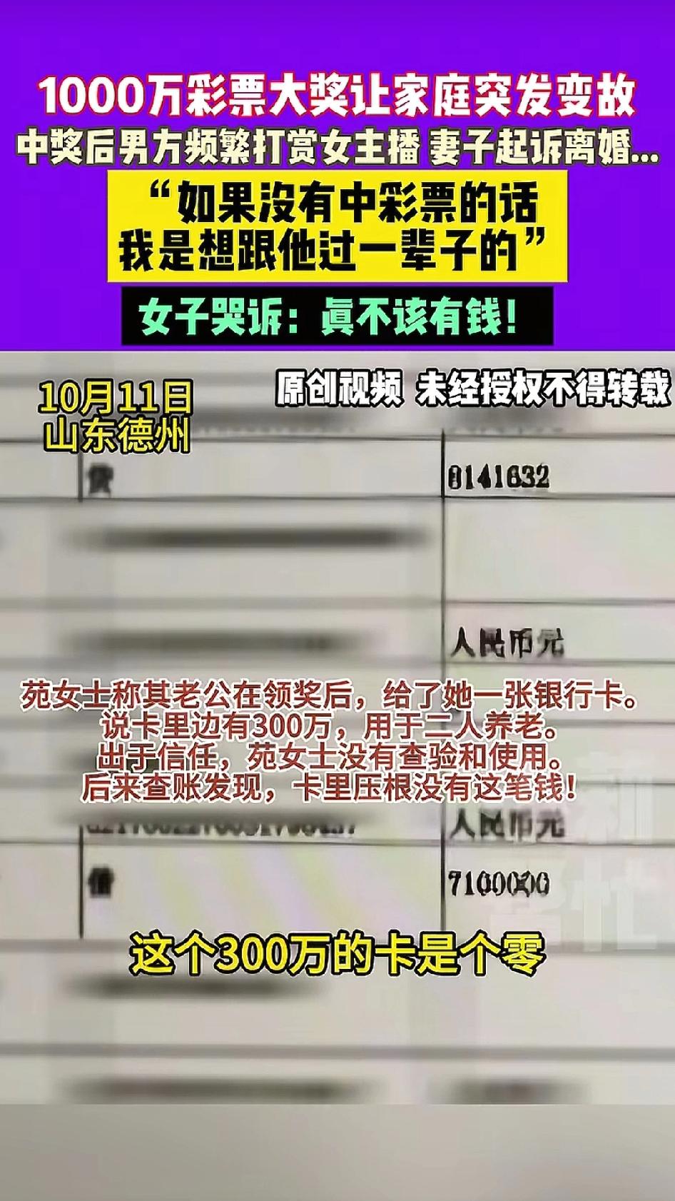 太神奇了,一男子仅仅花费42元买了彩票,最后竟然中奖1000万,税后合计到手814万多。男子回家交给妻子一张银行卡,号称有300万,用于两人养老。妻子基于信任,没有查看。可是,自从有了钱,男子就经常给美女主播打赏,妻子发现后,查了银行卡,里面没有钱。既然丈夫不给自己钱,女子就想了办法,婚姻存续期间所有收入都是夫妻共同财产,都有她的一半。既然老公不给钱,那就起诉离婚,法院会给自己判400万。 我认为,女子能够想到这个主意,也算是人中龙凤,只要是法院准许离婚,就会冻结她老公名下的银行卡,强制把钱给女子。真是聪明!! 男人有钱想找美女,想尝一下滋味,其实太天真了!天下女子一个味,守着一个“吃透”了就行。
