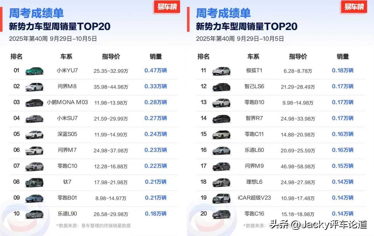最新周销量出炉,零跑断档领先,国庆销量大涨62%! 从最新公布的新势力第40