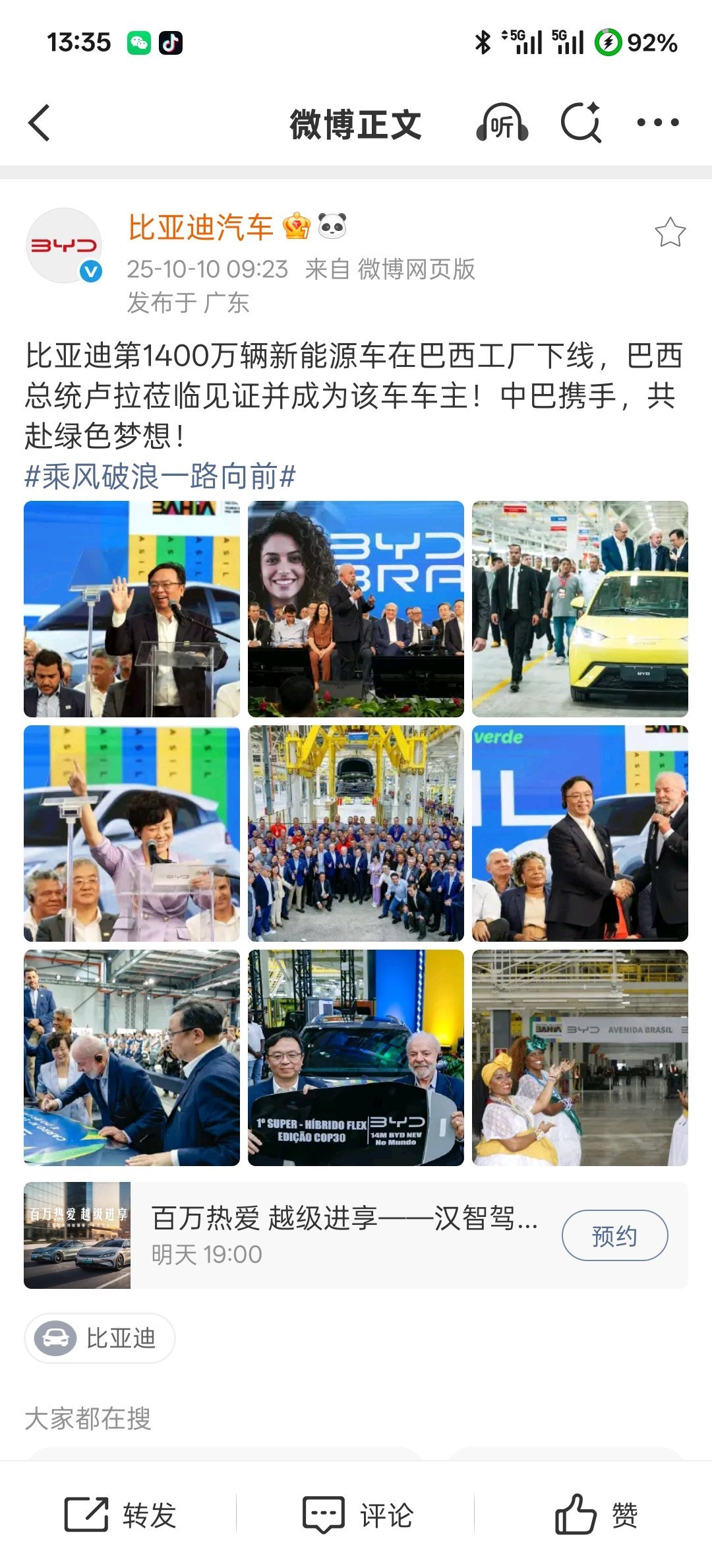 据比亚迪汽车官微,比亚迪第 1400 万辆新能源汽车在巴西工厂下线,巴西总统卢拉莅临见证,并成为该车车主。
