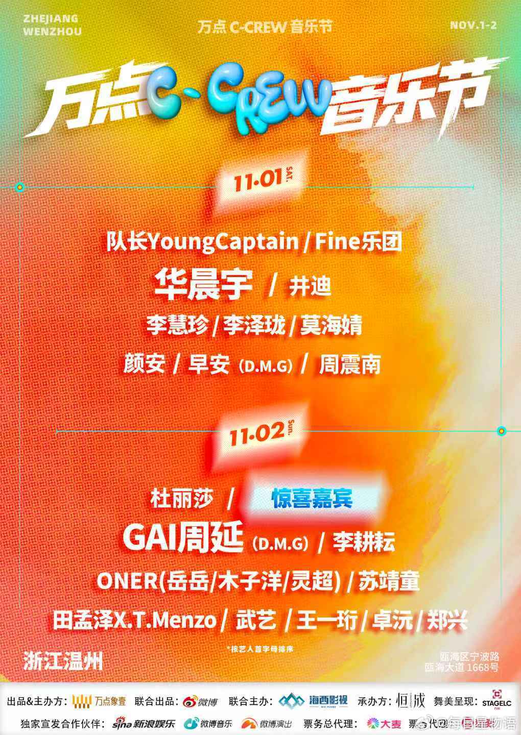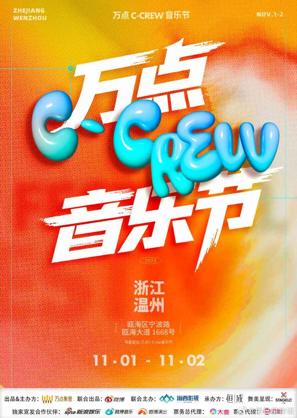 万点C-CREW音乐节万点C-CREW音乐节开票预告 全能舞台男团ONER强势加盟!岳岳、木子洋、灵超三位成员携七年默契,以高质量音乐与炸裂舞台掌控力惊艳全场!11月2日,期待他们用充满张力的表演点燃