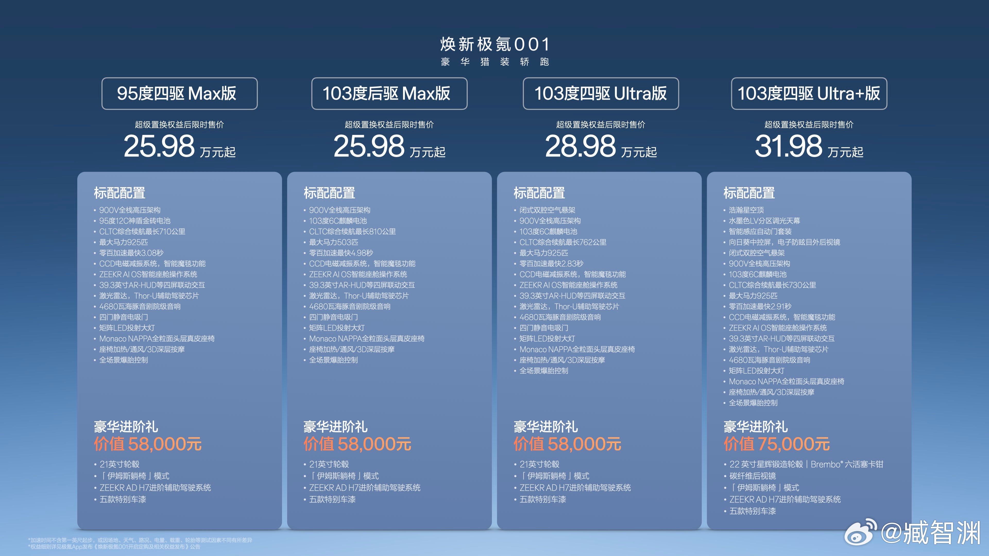 提前预告很久的新款极氪001发布了,四个配置都很高的版本,加上1W的置换权益后: