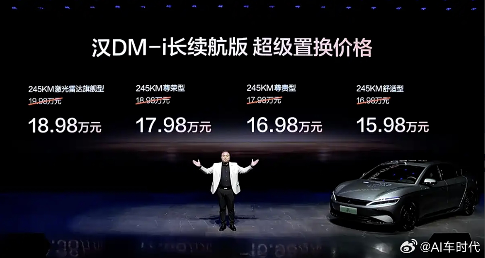 汽车评测[超话] 10月11日,比亚迪汉长续航版上市,置换价15.98万元起。汉DM-i智驾版新增纯电续航245km车型,汉EV智驾版新增635km续航车型,同时新车设计有所调整,配置优化提升。发布会上比亚迪王朝网销售事业部总经理路天透露,近期将为汉进行油耗OTA升级,馈电油耗将会降至3.35L/100km 比亚迪汉长续航版15.98万起上市