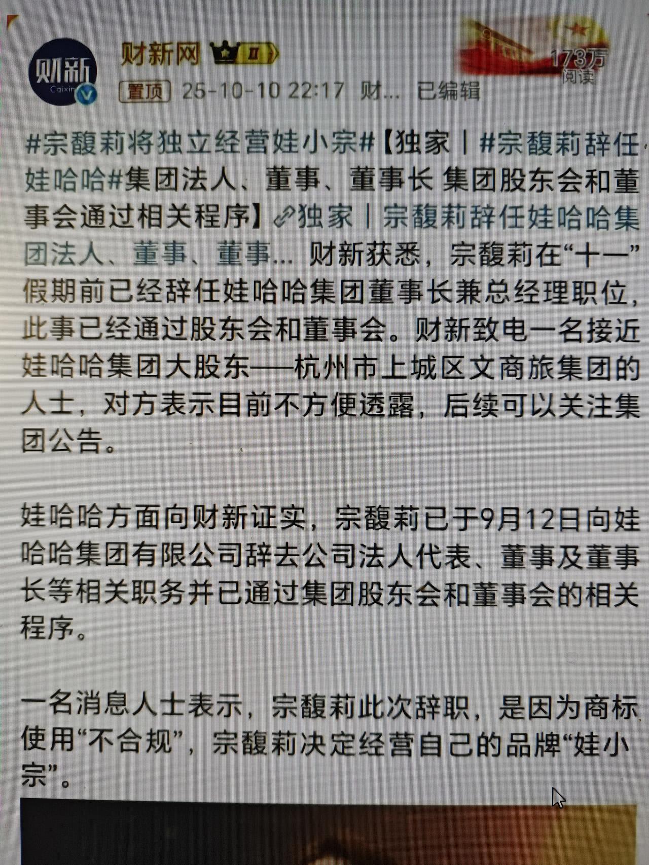 娃哈哈的问题摊开了 10月11日,即就是今天,“娃小宗”微博账号完成实名认证。认证主体为宏胜饮料集团有限公司。 而众所周知的是,宏胜饮料集团有限公司,最早是宗庆后成立的娃哈哈产品的代工厂。后来,经过宗庆后和宗馥莉两代人的不断打造,这成了完全“属于”宗馥莉的企业。 今天媒体爆料,宗馥莉在9月12日向娃哈哈集团有限公司辞去法定代表人、董事、董事长等相关职务,并已经通过集团股东会和董事会的相关程序。 也就是说,虽然宗馥莉继承了宗庆后,在娃哈哈集团有限公司29.4%的股份,但是,如今宗馥莉已经辞去了“职务”,成了纯粹的“二股东”。 其实,在2024年7月,宗馥莉就以退为进,公开提出辞去董事长等职务,结果引来网络舆论哗然。此后,宗馥莉正式成为娃哈哈集团有限公司的法定代表人,以及董事长。 不过,正如宗馥莉实际控制的宏胜公司,在大量注册“娃小宗”、“宗小哈”、“娃小哈”等商标时所说的,“因复杂历史相关问题不能在近期得到有效解决,导致公司(宏胜)经营始终处于相关风险之下”。 也算不上多复杂,就是拥有娃哈哈商标的娃哈哈集团有限公司,这是一家混合制企业,是杭州上城区文商旅投资控股集团有限公司占46%股份的企业。 当年娃哈哈集团与法国达能公司合资生产,但是,宗庆后通过“体外循环”,成立了大量的个人控股的公司,使用娃哈哈的商标与资源。这导致了需要两国政府出面处理的“达娃之争”。 宗馥莉继承的宗庆后的“遗产”,正是这种特殊的生产运营模式。娃哈哈集团有限公司和众多,包括宏胜公司在内的“体外公司”并存运营。 正如2022年的数据所显示一样,娃哈哈集团有限公司有点被“边缘化”了。2022年,娃哈哈系总资产370多亿,娃哈哈集团有限公司只有58亿,娃哈哈系总利润高达47亿,可属于娃哈哈集团的利润只有1871万元。 既就是这种情况下,宗馥莉上任娃哈哈集团有限公司董事长之后,依然在“削弱”娃哈哈集团,以“丰富”宏胜公司等她个人掌控的企业。 甚至,以娃哈哈集团董事长的名义,要求将娃哈哈商标全部无偿转移到她自己控股的宏胜公司名下。并将娃哈哈集团,从销售团队开始,到各部门员工,都被要求与改签合同到宏胜公司。属于娃哈哈体系的十几家公司被关停。 最典型的一个例子是,今年3月份,将杭州娃哈哈饮料用水公司桶装水销售经营权转移给杭州讯尔城通。前者成了代工厂,每桶水加工费2.75元,后者则以每桶水7元给经销商。这里的核心就是杭州讯尔城通属于宗馥莉控制的公司而已。 诸如此类的行为,用宗馥莉亲叔叔宗泽后的话来说,“火力四射、锋芒毕露、过刚易折”。没有了宗庆后时期,“对企业呕心沥血,对员工亲如家人,方方面面力求到位”,所谓的照顾到了各方面的利益,如此也才能让娃哈哈如“私营企业”样发展壮大。 当宗馥莉“锋芒毕露”后,她遇到了各种各样的阻力,甚至,连网络上有大量的舆论呼吁杭州国资委出面。毕竟,现代企业经营理念与市场化管理中成长起来的宗馥莉,没有宗庆后的“特色经营理念”。 如此以来,随着宗馥莉公开辞去娃哈哈集团董事长和法定代表人的行为,这娃哈哈集团有限公司的“利益纠葛”,就被摆上了桌面。此时,娃哈哈集团有限公司的股东们就得出面收拾“烂摊子”了。 同时,通过新商标品牌的注册,也通过运营自己控制的宏胜系公司,宗馥莉也有了一个证明自己企业家才能的机会与平台。 显然,问题摊开了很好。否则的话,历史遗留的问题,娃哈哈集团有限公司与众多包括宏胜在内的“体外”公司,必将发生冲突。不好说是否“国资流失吧”,这对宗馥莉来说,总是一把“达摩克里斯之剑”。