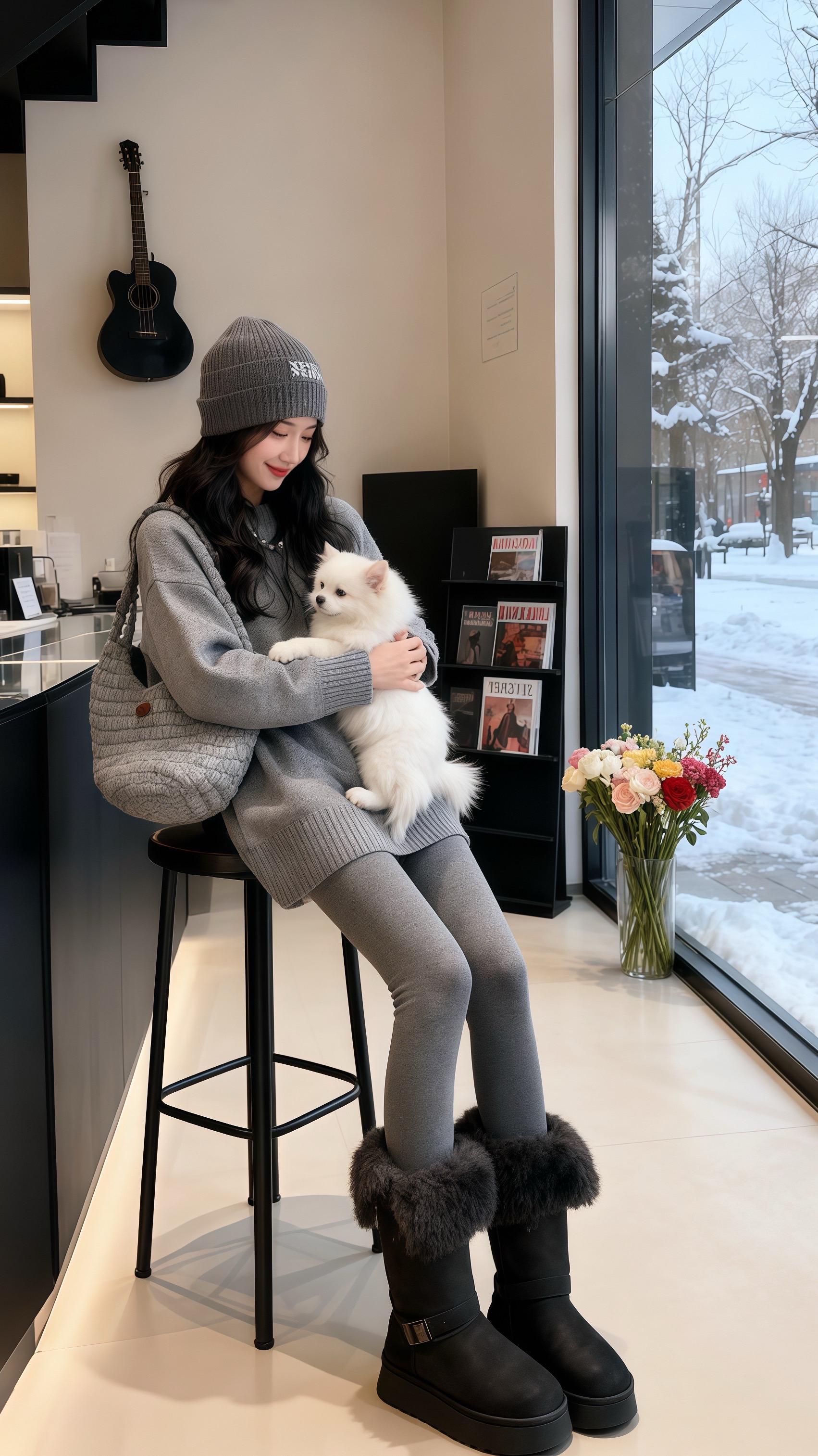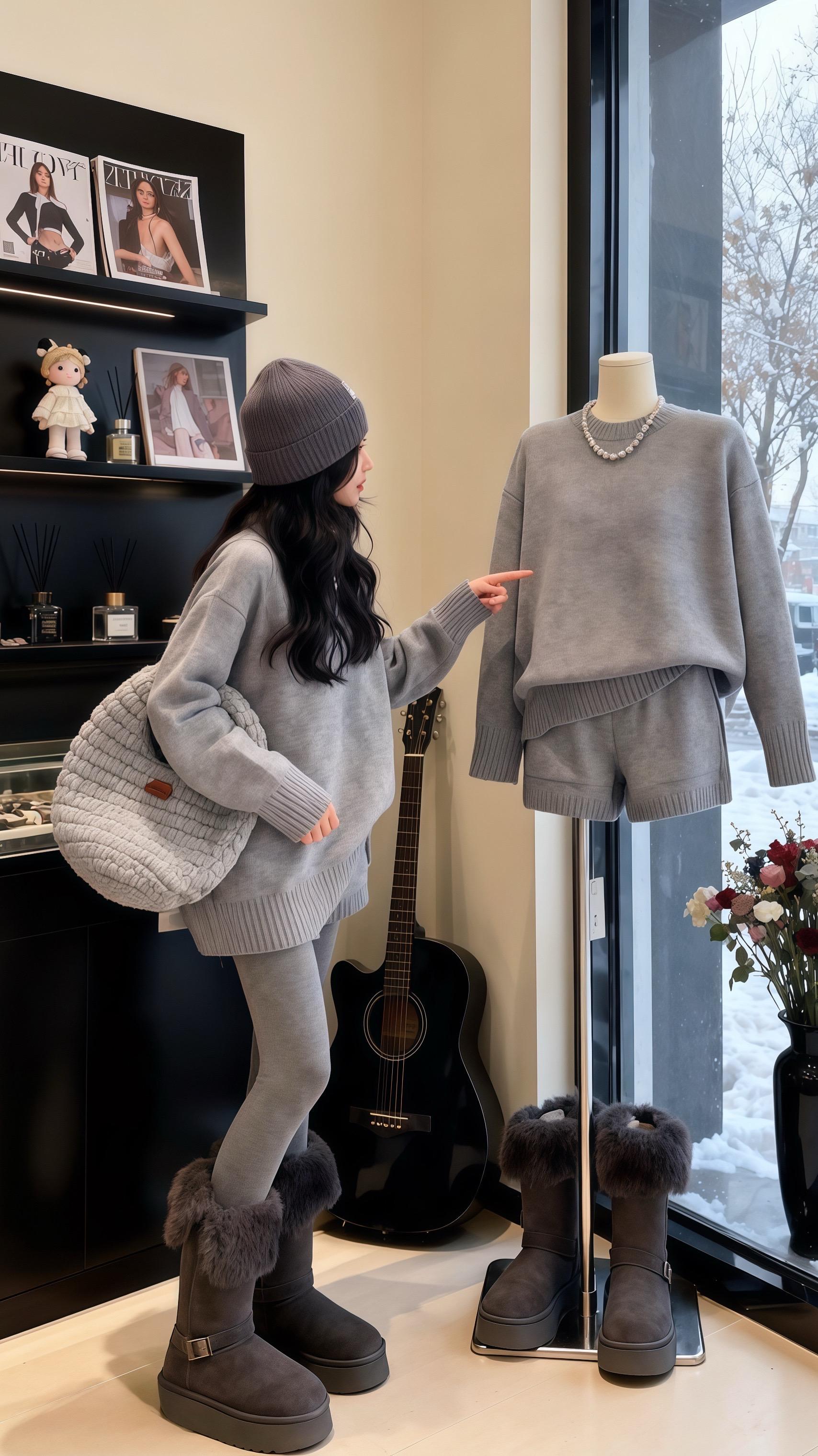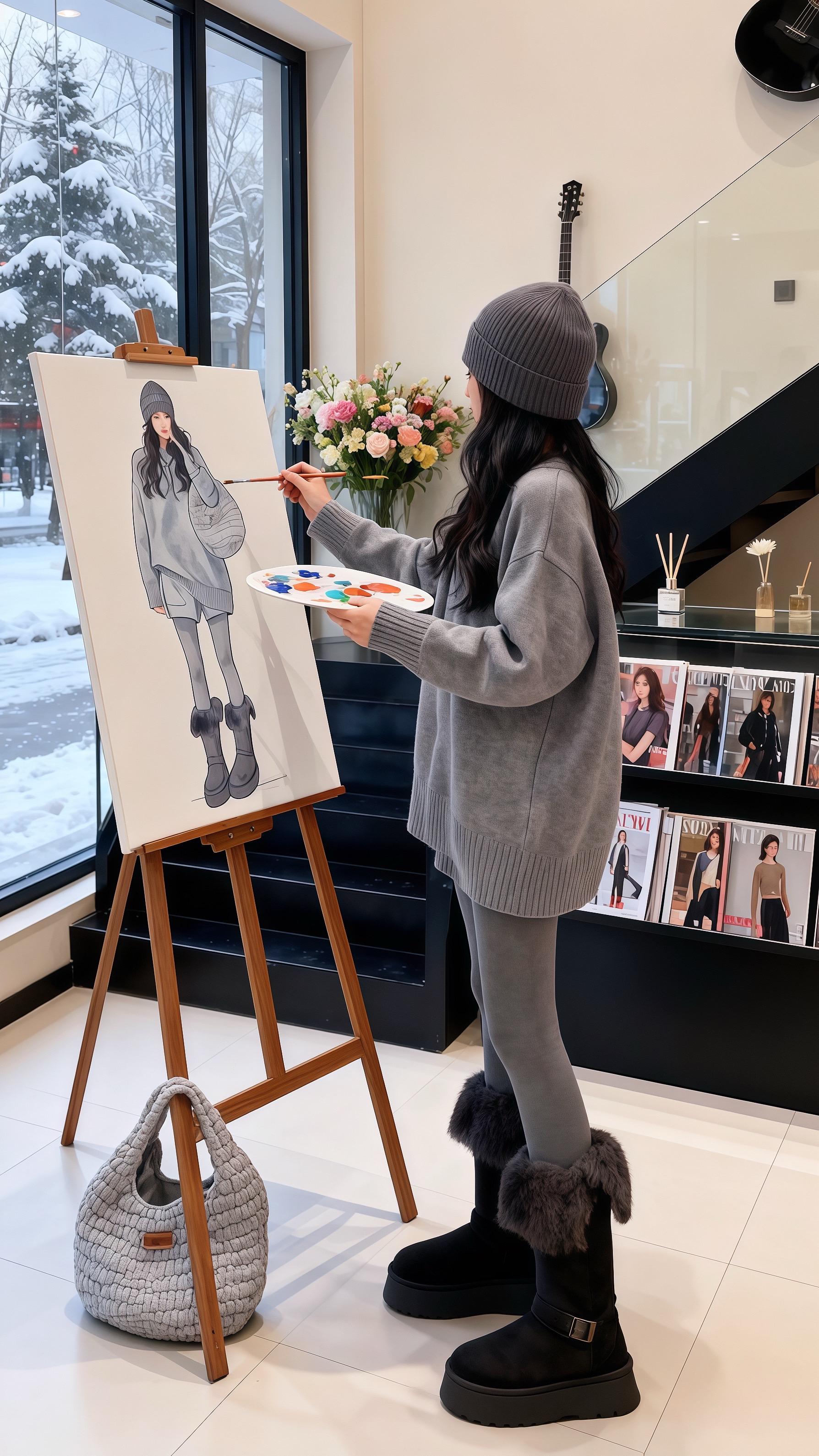 她指尖抚过模特身上同色系针织套装,灰得像未被惊扰的雪,却在毛绒靴口漾出灵动。转身抱起雪白博美,小家伙往她灰色毛衣里一钻,成了最鲜活的点缀。窗外雪簌簌落着,她却在室内用色彩造了另一个暖冬——画架上,她把自己的穿搭画成时装插画,笔触里满是对灰色系穿搭的巧思: Oversize毛衣的慵懒、加绒 leggings 的贴心、厚底靴的俏皮,每一处都藏着冬日不冻人的时尚小心机。