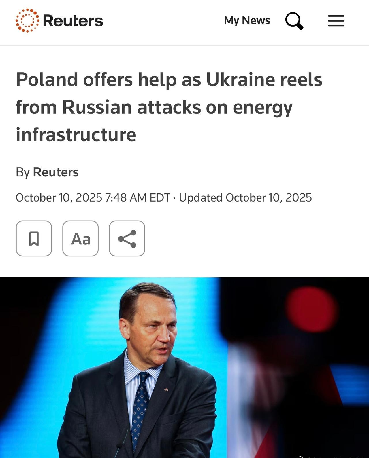 路透社:波蘭外交部長西科爾斯基表示,波蘭已準備好向烏克蘭提供發電機、額外電力供應