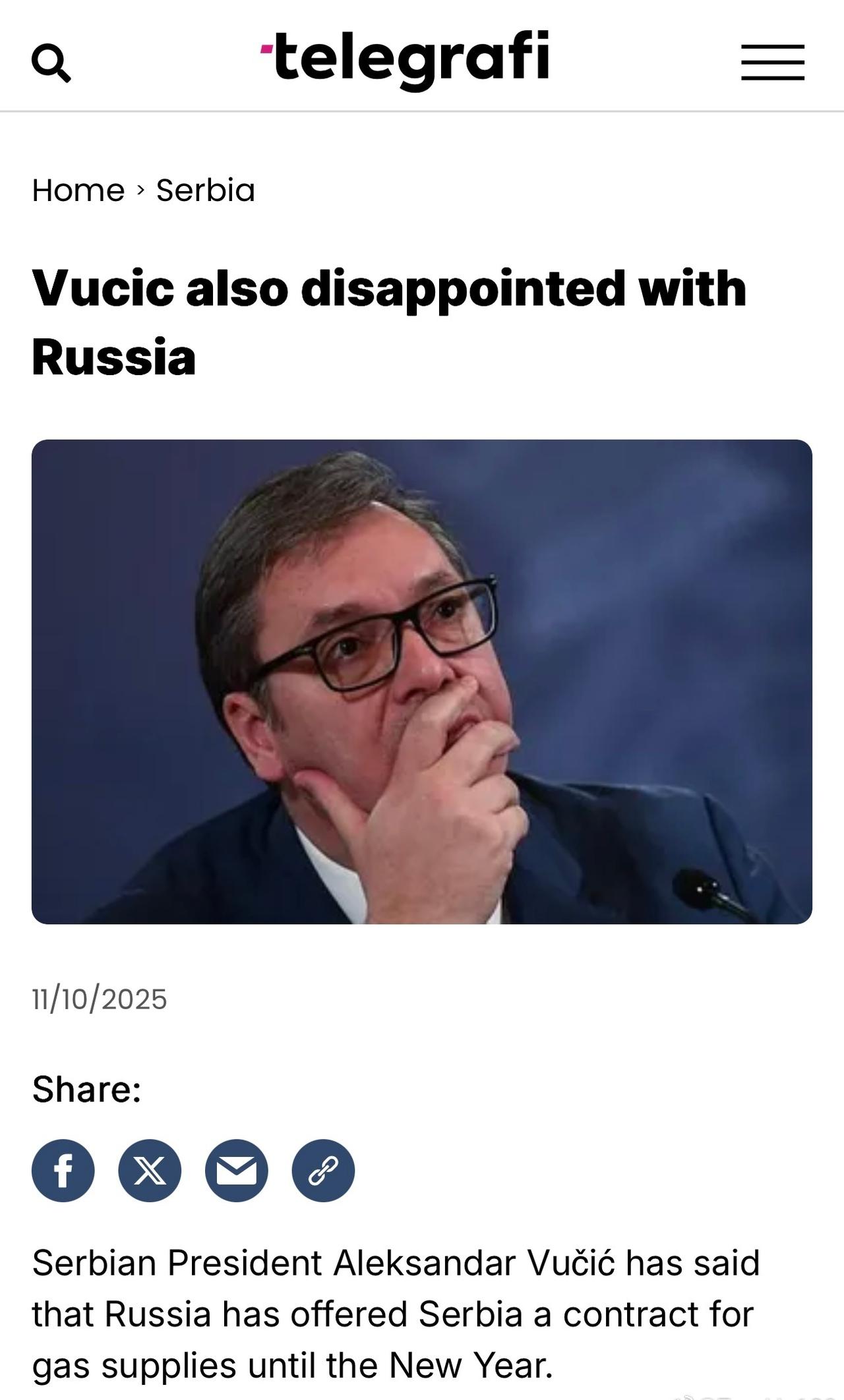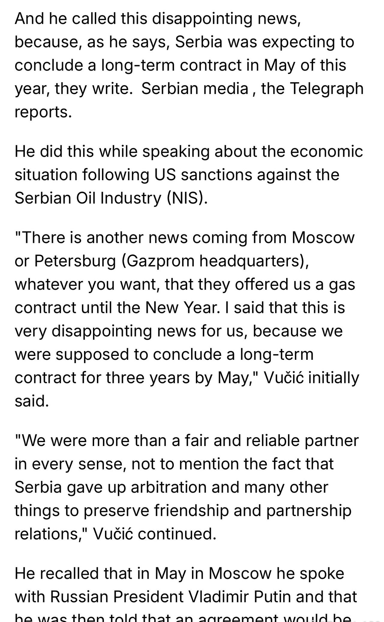 武契奇:塞爾維亞當局對俄羅斯提出的延長天然氣供應協議有效期僅至2025年底的提議感到失望 「我們從莫斯科或聖彼得堡收到消息……他們提出給我們一份到新年的天然氣協議。我說這個消息非常令人失望,因為我們原本應該在5月前達成一份為期三年的長期協議。 從各方面來看,我們一直都是一個非常誠實可靠的合作夥伴,更不用說塞爾維亞為了維持友誼和夥伴關係,放棄了仲裁和其他許多事情。 」