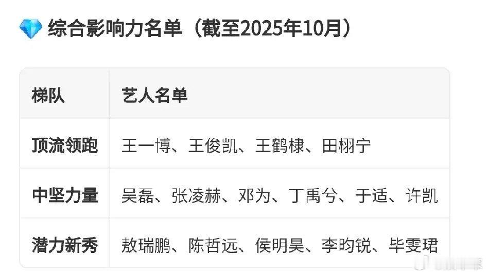 顶流领跑层:王一博、王鹤棣、王俊凯、田栩宁