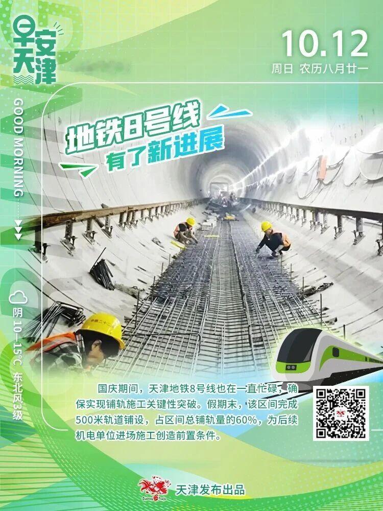 【早安天津】地铁8号线有了新进展 国庆期间,天津地铁8号线也在一直忙碌,确保实现铺轨施工关键性突破。假期末,该区间完成500米轨道铺设,占区间总铺轨量的60%,为后续机电单位进场施工创造前置条件。(设计:贾静)