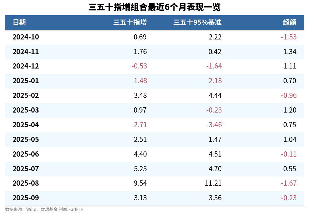 “三五十指增”组合九月上涨3.13%,相比我拟合的三五十95%基准指数(三个指数逐日等权重再平衡占95%比重+5%中证货基指数)同期3.36%的涨幅,跑输0.23个百分点。这是8月之后,又一个跑输的交易月。不过相比万得全A九月2.8%的涨幅,还是有些许超额的。