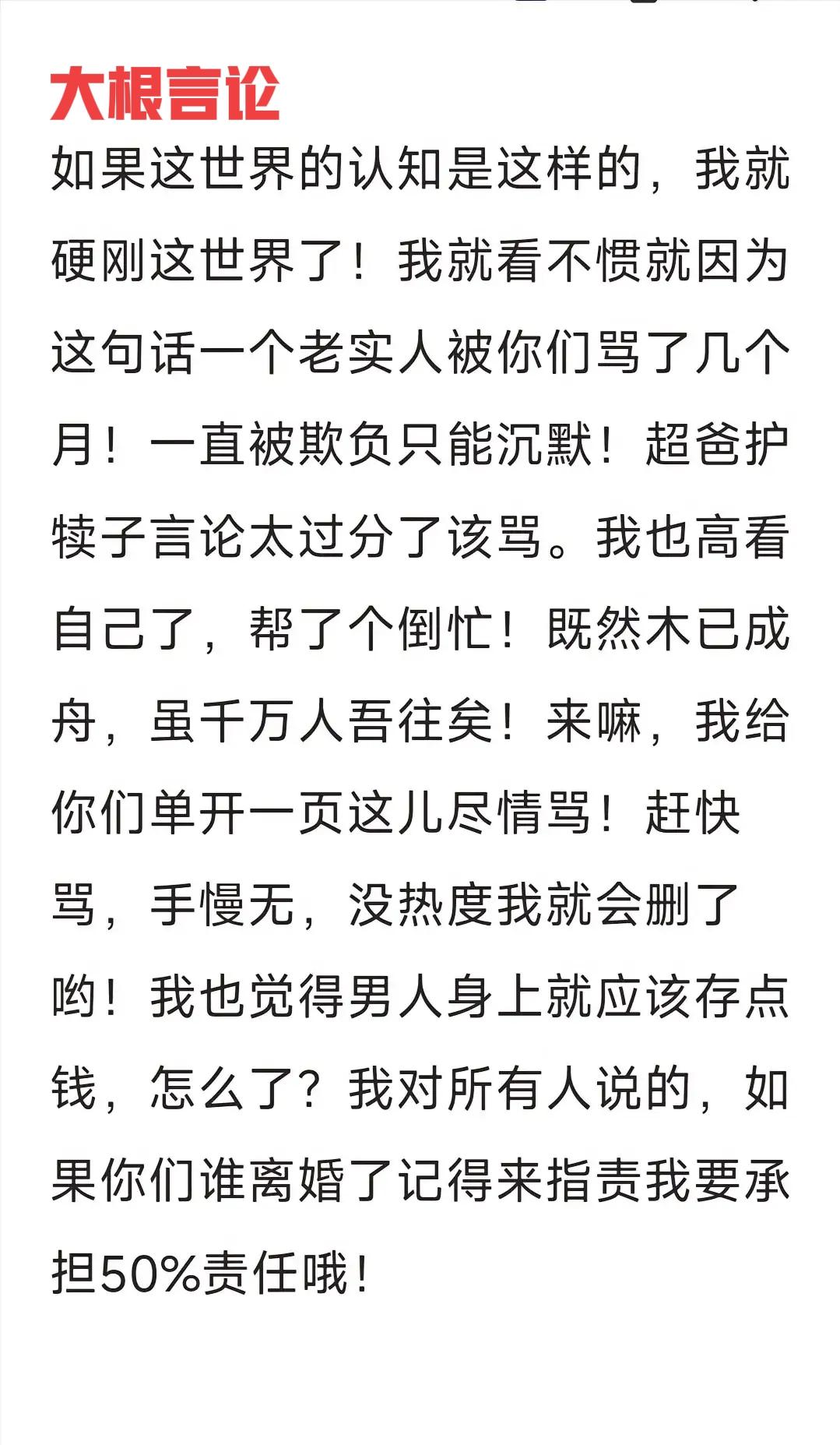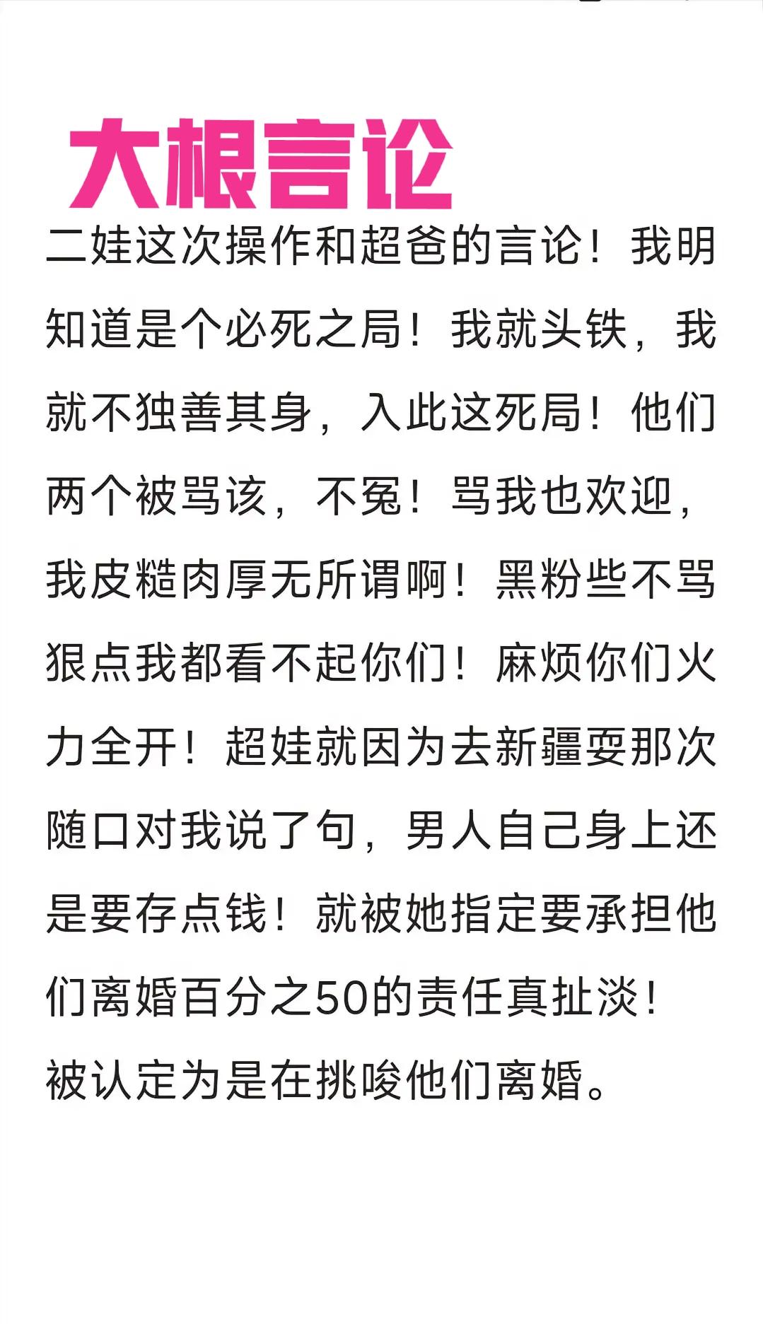 从小妹儿与小二娃的离婚看到一个真实的现象, 好的婚姻不是物质的堆砌,而是彼此尊重与信任! 最近由于小二娃离婚半年快速订婚的节奏,引得不明真相网友对小二娃的讨伐。 网友心中对美好婚姻的向往:小妹儿与小二娃相亲相爱,孩子听话,有说有笑! 小妹儿与小二娃的婚姻原因: 小妹儿:吵架冷暴力所致。 小二娃:吵架性格不合。 大根:女方怪小二娃的堂弟超娃挑事!承担50%的责任。 超娃:不关我的事,出门游玩玩笑引起误会!昨天又回应过。 [微笑]好的婚姻要自己经营,不要怪到别人身上去,不是别人一句玩笑就闹到破碎,不离婚大家的感情都非常好,离婚了被迫要站队,撕谁都好看! 小二娃出门从来身上都没有钱,这一点他自身可能也有意识,身为一个老板,口袋空空,在特殊的环境下容易联想到自身的不方便! 超娃,小妹儿他堂弟,大根,小二娃,他们几个大男人几个游玩,超娃对大根说的一句,男人要有一点私房钱在身……这句看似普通的话,被有心的小二娃听了去。当时的情景再现,只有这么几个大男人放松随意尴聊,恰逢超娃身上保不齐也是没有很多钱的,小二娃身上也没有…… 小二娃回去向小妹儿要钱的时间如果发生在游玩后很紧的时间内,那很容易被带入另一环境:平日里好好的没有钱也不说什么,怎么小二娃几个人去了一趟就要一点私房钱了?? 矛盾很容易嫁接,嫁接到是谁说要私房钱的,得出听谁说的, 那么在小妹儿眼里超娃就会背上一个挑拔的锅……那离婚超娃有50%的责任。[捂脸] 大根就会为超娃自证不关超娃的事, 超娃就会给自己自证大家是在玩笑中说的,不是指向谁。 小妹儿表弟就会两头看着说啥也不对,到最后他还是站他姐。 小二娃就会表达自己的不满,本来身上就没有钱,男人要点尊严,要点钱不行吗? 还能闹到上纲上线?? 婚姻,怎么经营,完全是靠个人,说白了,男人需要什么他清楚,但为了家,如果是选择隐忍的,矛盾爆发时就相当厉害。 一个小家庭谁在管钱?是一门课。要有智慧去管,管得男人心服口服,心甘情愿那才是有意义的。 不然,管字听起来就很刺耳…… 一个有爱的家庭, 男人耙耳朵的多得是, 是这个男人愿意成为耙耳朵,男人可以成为妻管严的前提条件是:要的他心甘情愿他对女人的欣赏与认可与饮佩。 女人如何让男人成为有尊严的男人? 其实是女人的话题。 就是因人而异,看他的需求,协助他完成在家在外的身份转换,他会感谢女人的宽容大度和智慧。 离吧!总是有大原因和细化分开来看情况的原因…… 好的婚姻不是物质的堆砌, 而是彼此尊重与信任! 有了钱有了孩子有了车有了房, 夫妻关系更要重整,旗鼓相当爱情要一起成长,消耗殆尽的情份恰恰最严重的就是无休止的争吵与谩骂。 男人应该懂男人, 女人应该懂女人。 其实反过来问, 男人为什么不懂女人?女人为什么就不懂男人呢? 能将女人为什么会懂男人了这门功课完成,女人就真的是能成为男人的贤内助…… 看看身边的有智慧的女人是怎么经营家的? 参考一个自己最喜欢的,照着做……成伴功倍。(这只适合女人认清男人是家中的顶梁柱这个立场啊!勿喷) 从只讲婚姻来说, 我的愿望是有情人终成眷属,不是终成兄妹! 小妹公开谈离婚 川乡小妹儿婚变 二娃订婚 离婚娃 小妹儿日常 小二娃婚变