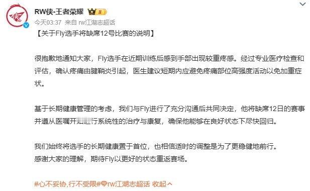 RW侠发出公告,Fly选手因手部腱鞘炎引发疼痛,需接受系统治疗与康复,预计短期内不会高强度训练,以避免加重症状,且今日也将缺席KPL的比赛。