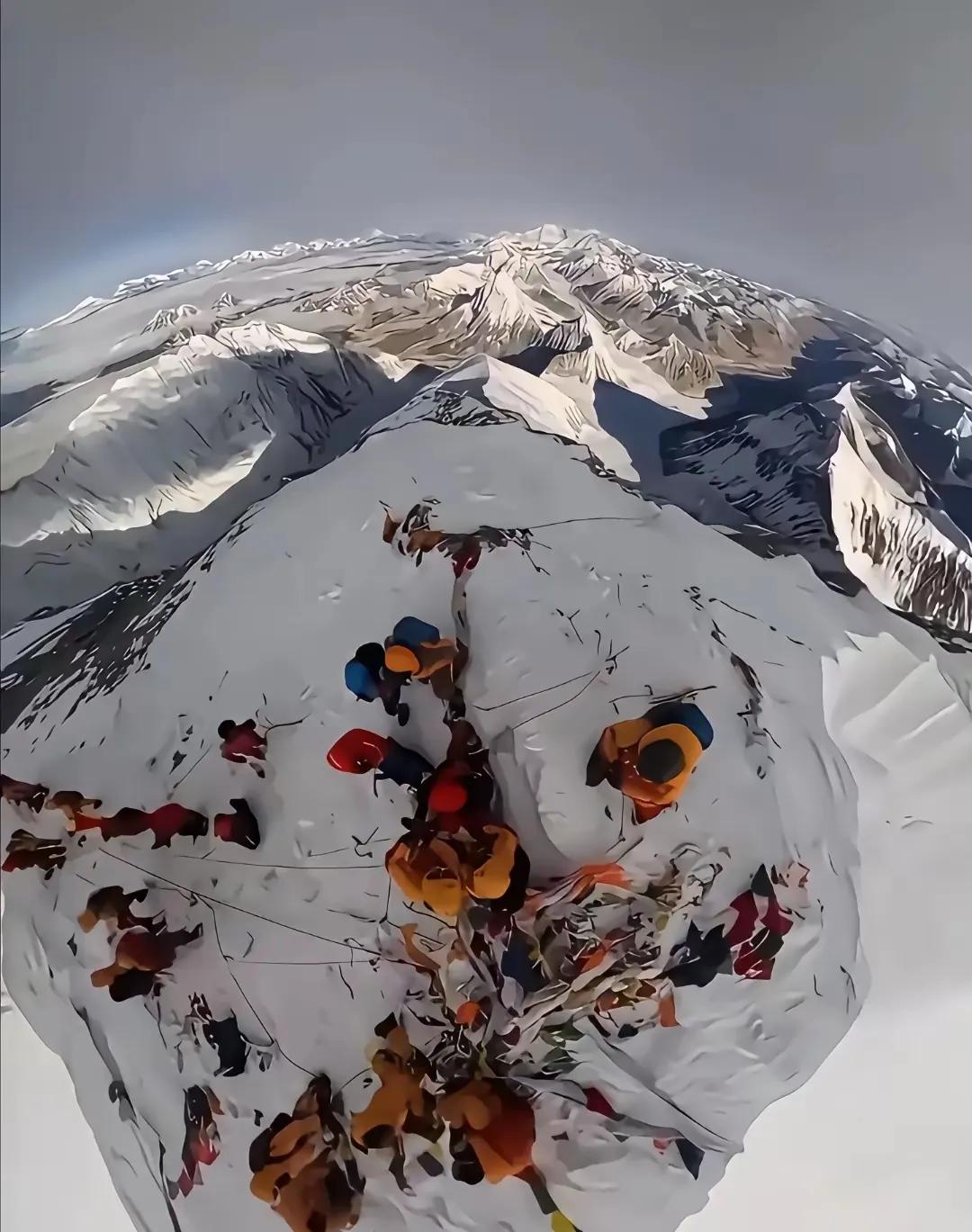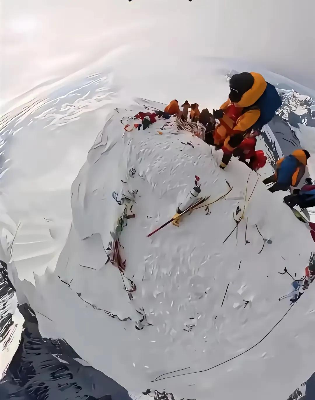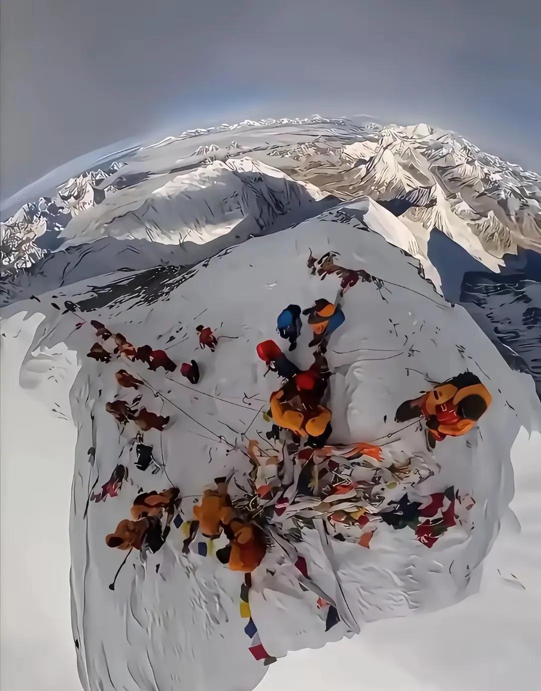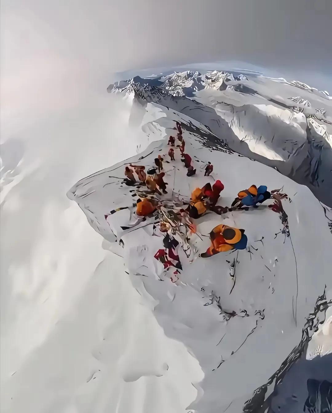 你敢相信,这是珠穆朗玛峰山顶? 怎么是个不大的平台,还以为是一个尖尖的峰顶呢。 当我看到这个峰顶后,就觉得珠穆朗玛峰的神秘面纱没了,滤镜没了,想想不过如此。 这山顶原来是尖的,后来登珠峰的人多了,一波接一波的登,上去的人要找休息打卡拍视频的地方,他们给削平了。 地球其实很平的,按比例来讲,珠峰还没篮球上的小疙瘩高。 如果爬上去的人,用铁锹把山顶敲掉5公分,是不是就改变了地球最高尺寸了? 地理书的最高峰数值是不是都得改了?
