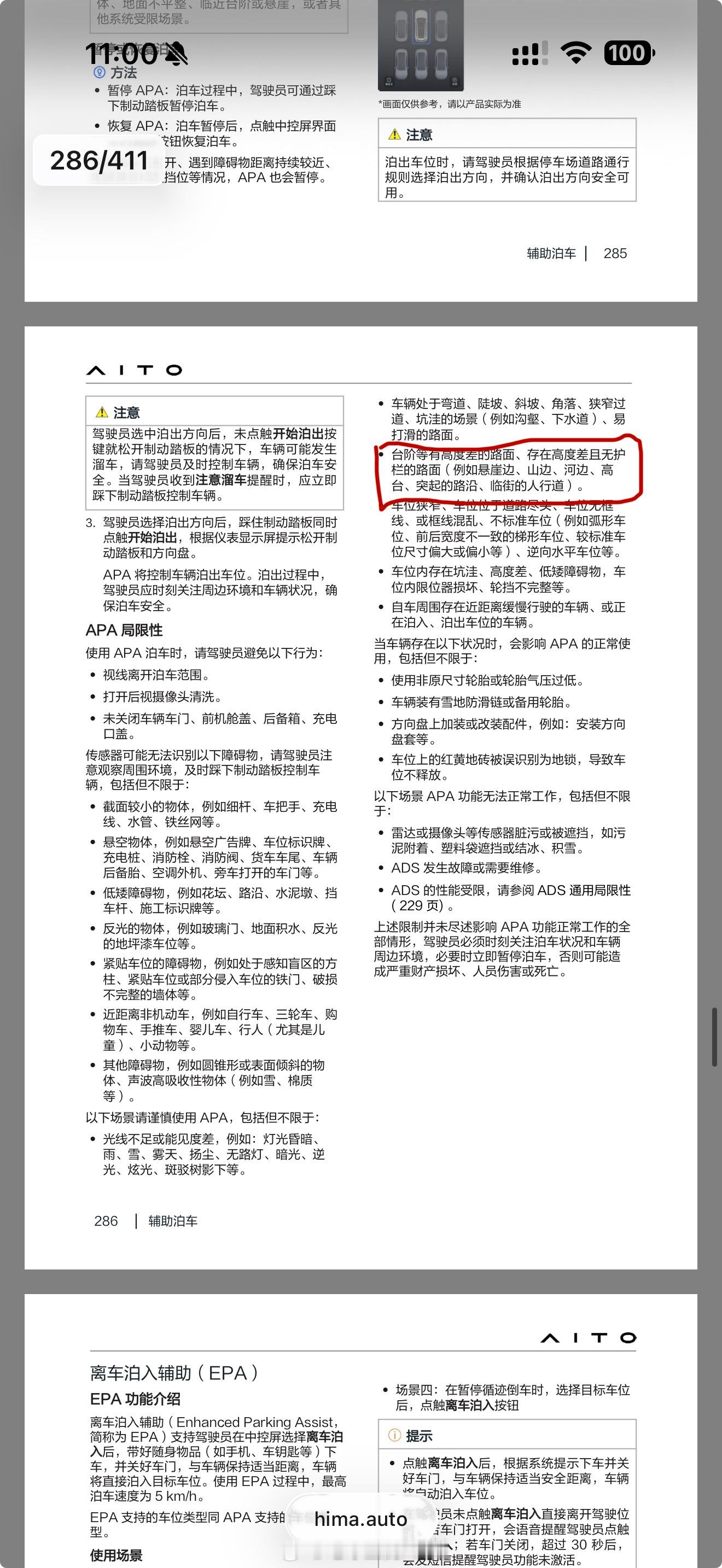 反正,我随便找了一个鸿蒙智行高端车的用户手册,写的谨慎使用场景里,就有这个高度差场景