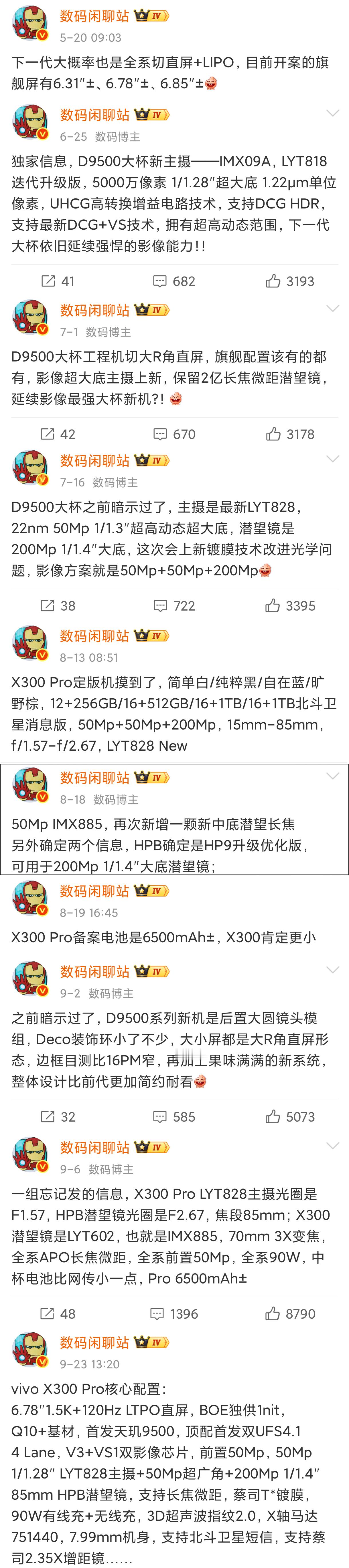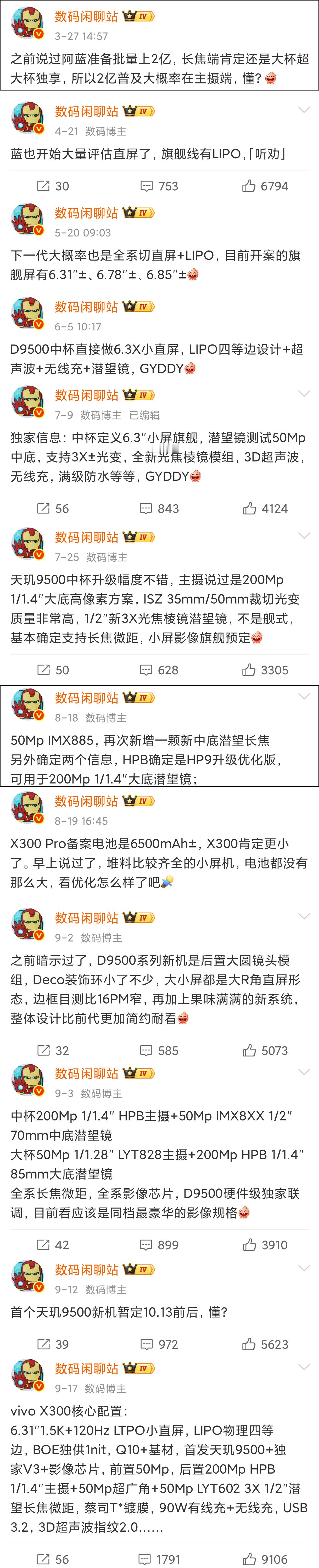 X300:6.31"1.5K+120Hz LTPO直屏,1.05mm四等边,BOE Q10+基材,天玑9500+V3+影像芯片,前置50Mp,后置200Mp HPB 1/1.4" F1.68主摄+50Mp超广角+50Mp LYT602 70mm 1/1.95" F2.57潜望长焦微距,蔡司T*镀膜,6040mAh+90W有线充+无线充,USB 3.2,超声波指纹2.0,IP68+IP69,7.95mm/190g