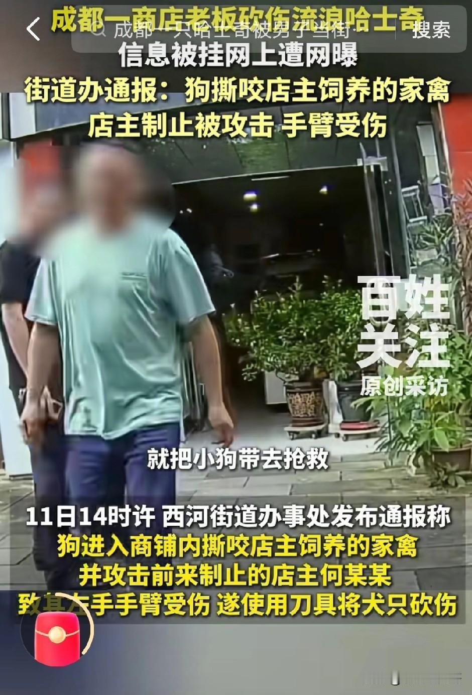 成都哈士奇流浪狗被店铺老板砍伤, 老板有错,爱狗人士更有错! 老板说他的鸡被这条流浪狗咬伤,他还被流浪给抓伤,但也不是老板可以处置流浪狗砍伤它的理由。如果任何人都可以随意处置流浪狗,将会给以此获取利益的人滋生合法的土壤 。店老板正确的做法是报给街道或者帽子叔叔,有叔叔戓街道出面,还有可能追溯到流浪狗的主人, 那样老板就可以向流浪狗的主人索赔了 。 流浪狗的管理和处置是街道的责任。 店老板因为流浪狗造成的损失可以向街道主张权益。 流浪狗被砍伤以后送去治疗,由于不忍流浪狗痛苦,对它实施安乐死是正确的做法,也体现了人类的善良;爱狗人士 以店老板砍伤流浪狗太残忍为由 ,对店老板实施报复,在店铺门口放置花圈已经超越了爱狗的范畴,严重损害他人的合法权益,已违法! 素材来源:百姓关注