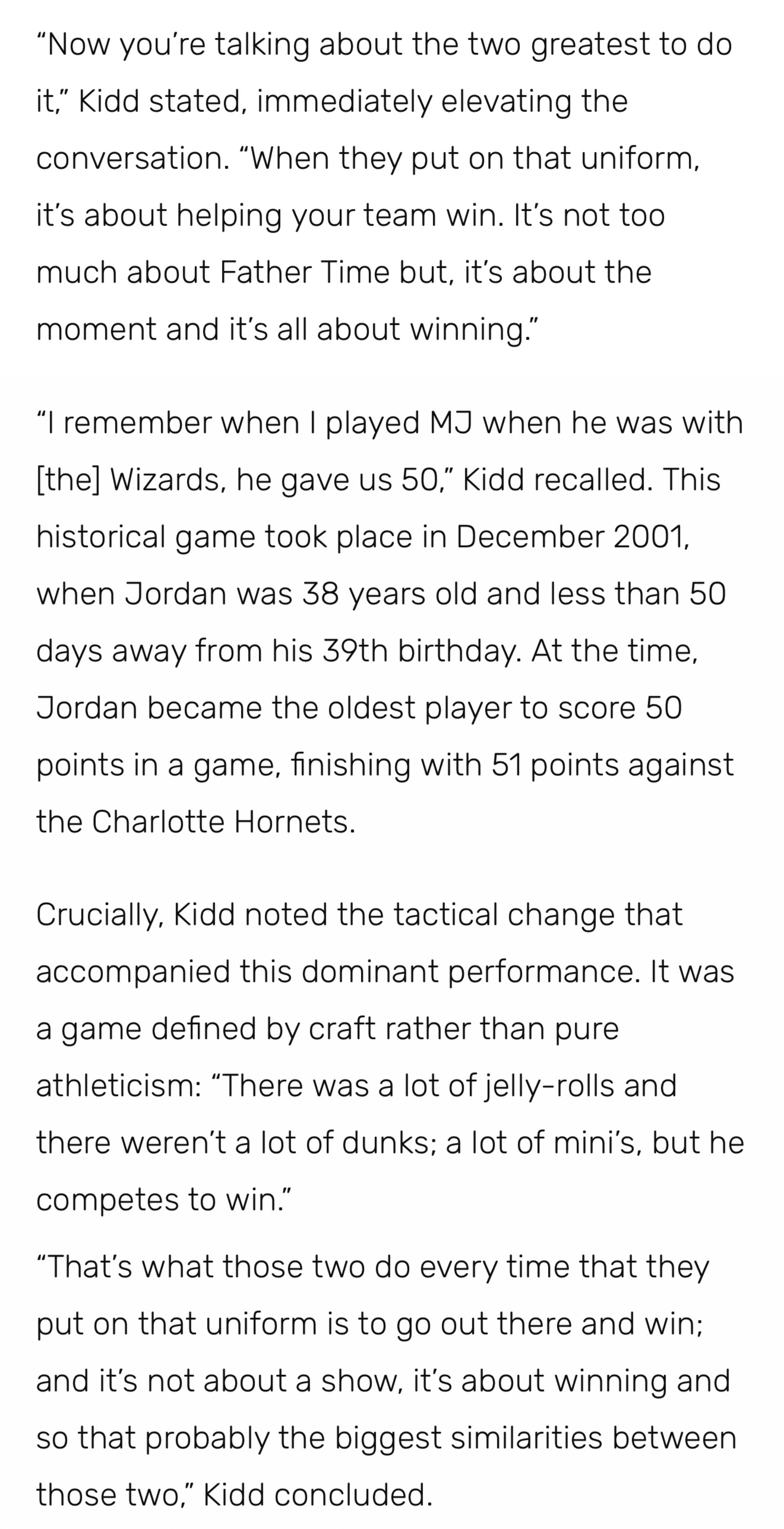 “我记得当年对阵身披奇才战袍的乔丹时,他曾在我们头上砍下50分,”基德回忆道。这场载入史册的比赛发生在2001年12月,当时38岁的乔丹在距离39岁生日不足50天时,对阵夏洛特黄蜂队狂砍51分,成为史上单场得分50+最年长的球员。