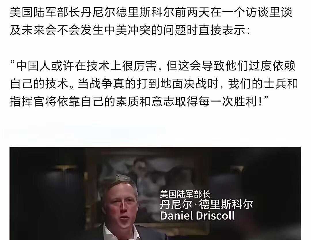 这是,2025年,美国陆军部长,对美国人的最新言论? 这可真是应了,三十年河东三十年河西啊。 他公开承认:中国的技术迭代,已经超出他们的“认知范围”、如果所有技术都失灵,“回到最原始的地面作战”,他非常有信心,谁能赢。[捂脸][不看][泪奔]