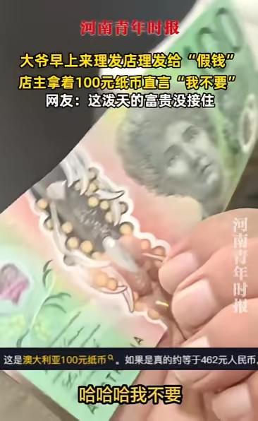 “这下后悔了吧!”10月11日,在江苏徐州,一位大爷到理发店理发,结账时递给理发店老板一张红绿相间的“百元大钞”。老板气得直呼大爷是“熊老头子”,事后才发现大爷给的竟是澳元,价值462元人民币!网友纷纷调侃:这泼天的富贵没接住! 这一事件着实引发了众多网友的热议。大爷结账时拿出一张颜色特别的“百元大钞”付款,理发店老板起初以为是普通人民币,仔细一看才发现是澳元,价值约462元人民币。这般“意外之财”,不仅让老板大为惊讶,也让人真切感受到富贵突如其来的气息。 从这起事件中,有几个要点值得关注: 货币识别误差:澳元和人民币外观存在一定差异,若不仔细辨认,很容易认错。这警示大家面对陌生货币时需格外留意。 大爷的意图:大爷或许是不小心用错了货币,也可能是想增添些趣味。不管怎样,这次“误会”颇为有趣,也凸显了不同货币在日常生活中的“隐性差异”。 老板的反应:老板反应颇为激烈,称大爷为“熊老头子”,可见当时的惊讶与不满。这也引发了网友们的调侃与共鸣。 网友的评论:有人觉得这是“泼天的富贵没接住”,调侃大爷财运好;也有人认为生活中碰到这种“意外之财”十分有趣。 总体而言,这一事件虽小,却反映出人们对财富、货币的关注与兴趣,同时也提醒我们在日常生活中要留意识别货币的真伪和面值。
