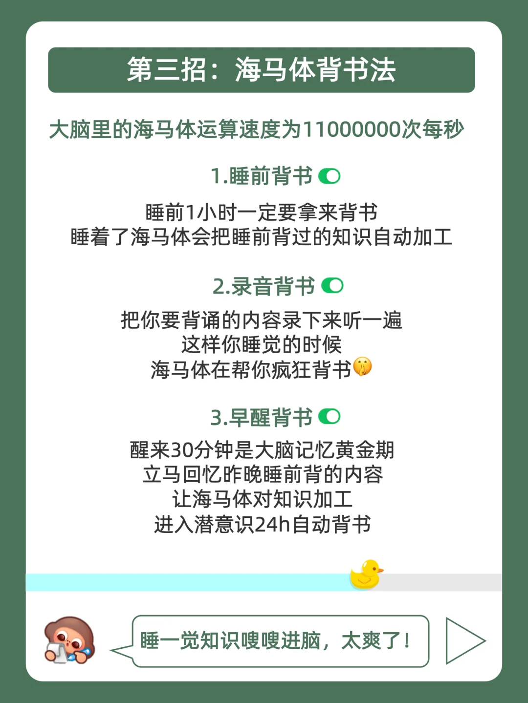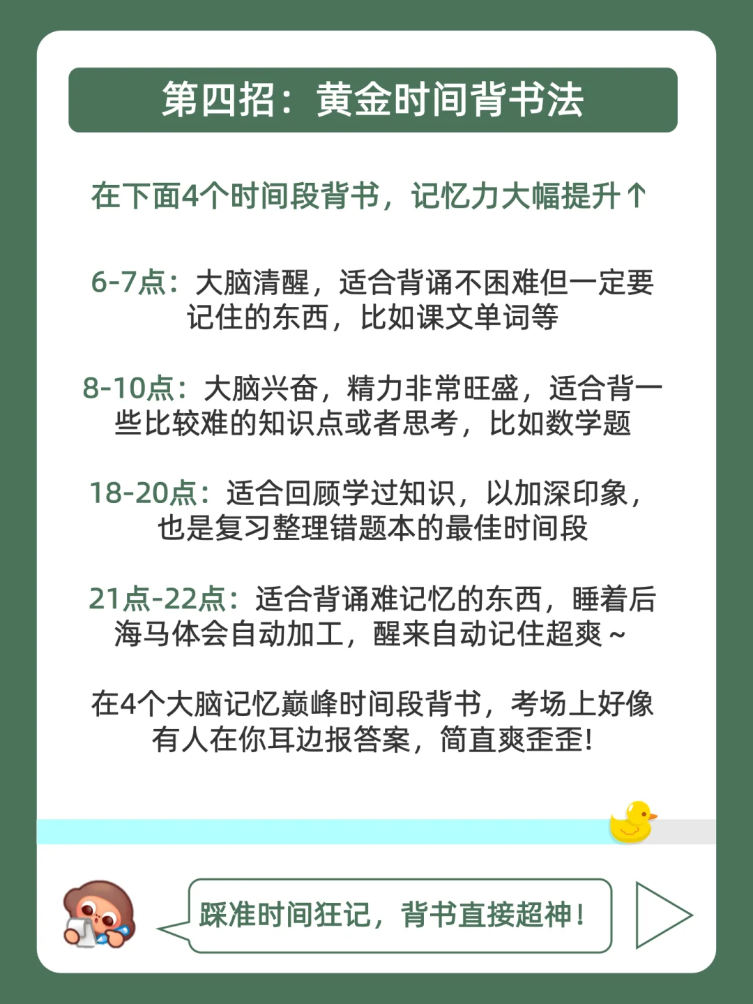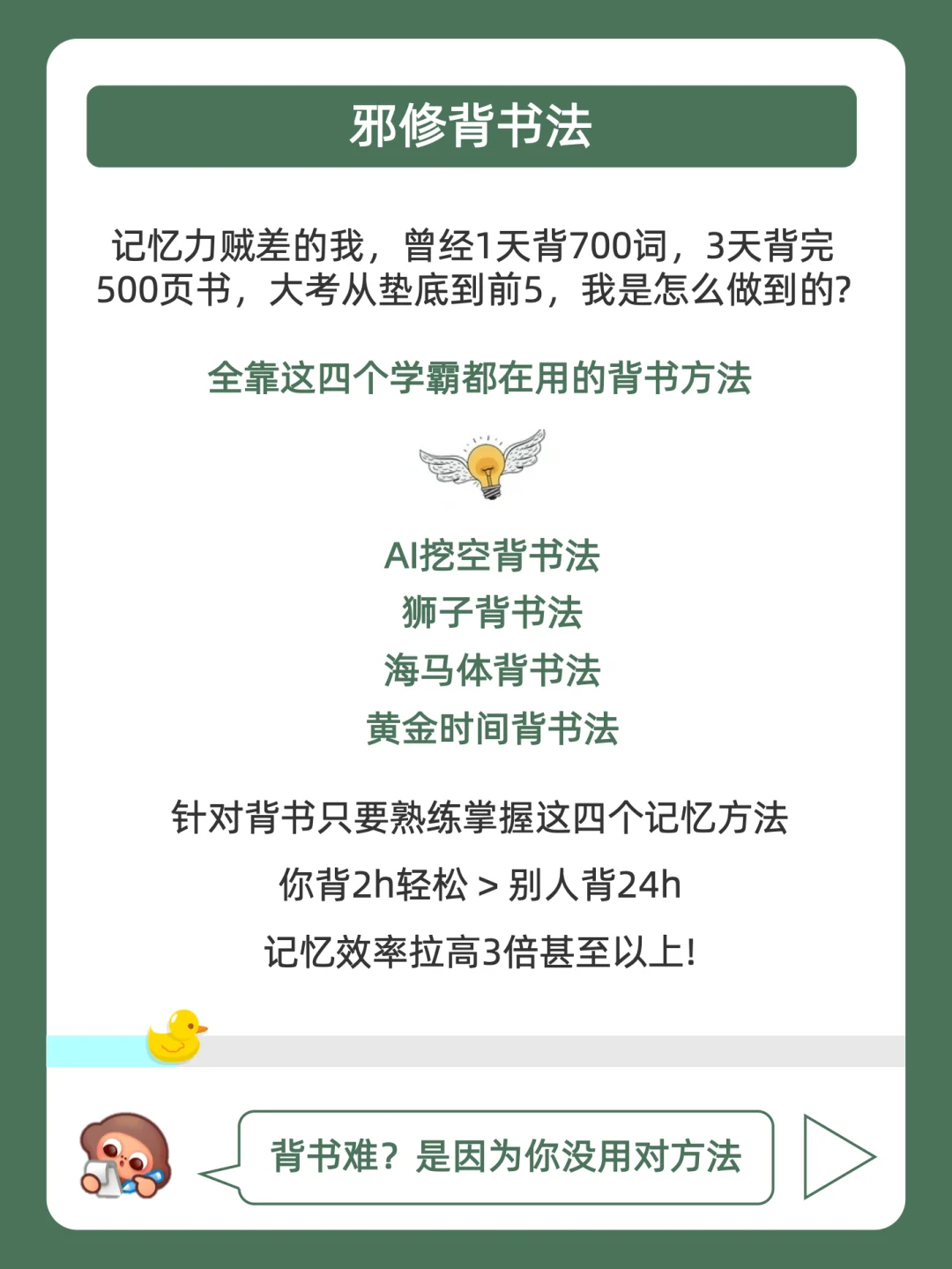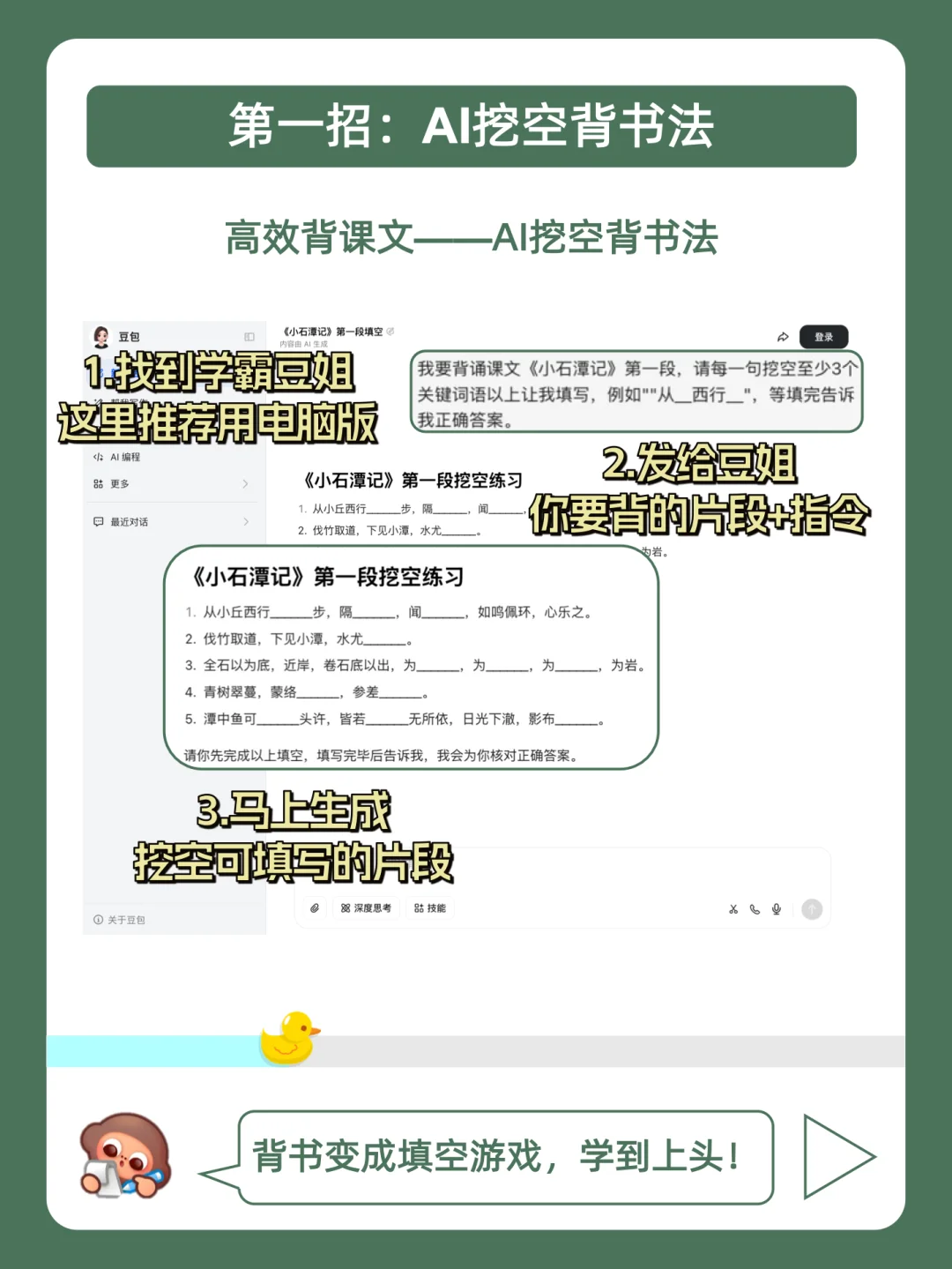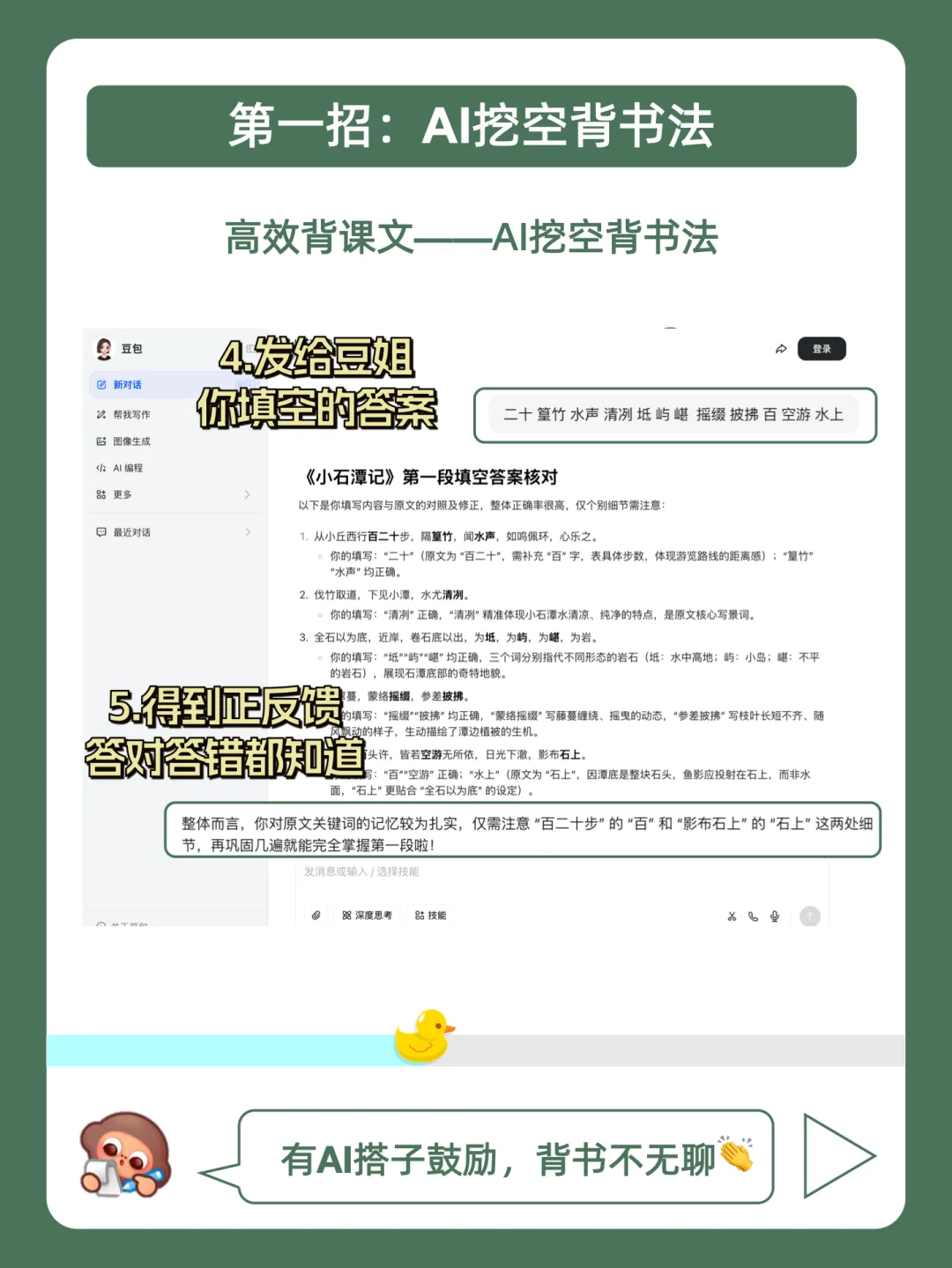 学习摆烂不用怕,鸭鸭带你做学霸❗ . 最近好多宝子问学长,快考试了,有没有无痛但有效的背书方法? . 今天就来分享,4个变态背书法,都在上面的图,看完就会用,从此一天背300词,偷偷起飞! . 其中学长经常会找豆姐抽背课文好好用,比较推荐电脑端很方便!不用再像以前一样没有重点的乱背几小时,现在豆姐自动帮咱挖空,只背重点信息,记忆效率嘎嘎稿!具体的指令放在下面啦,大家快去试试看吧! . 我是鸭鸭学长,持续更新优质背书方法,陪你无痛背书,记忆开挂!
