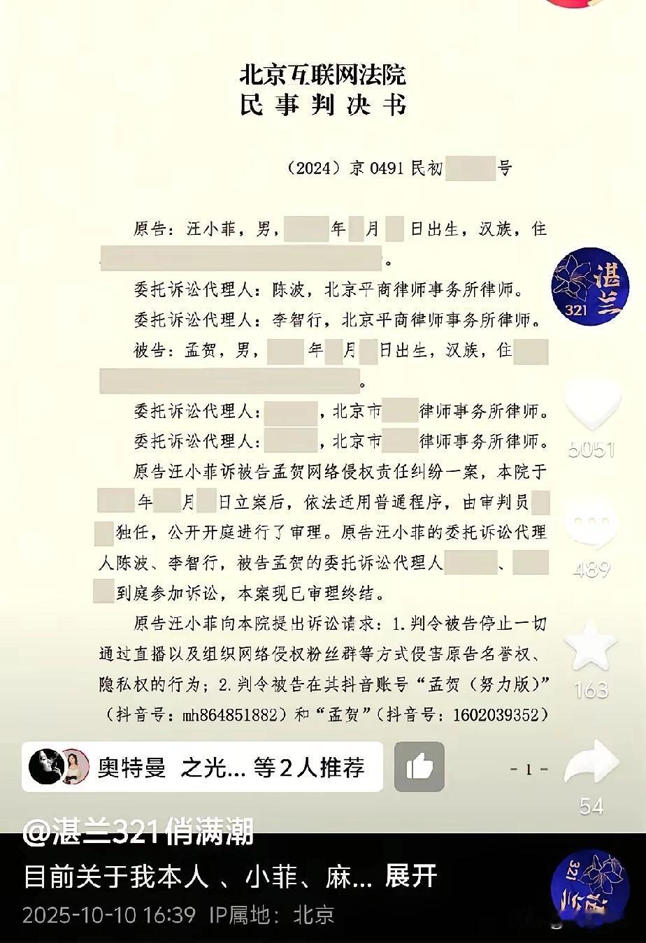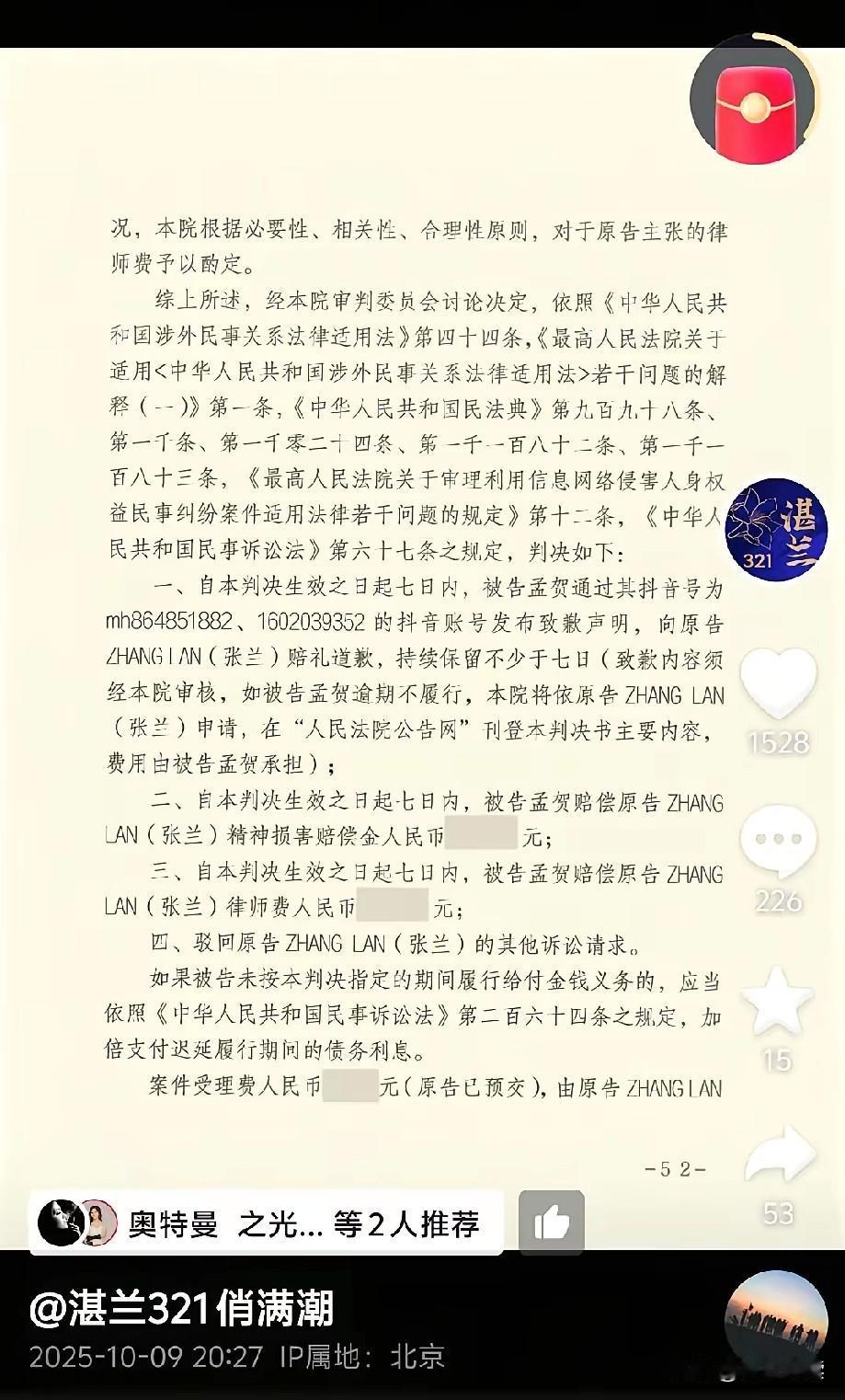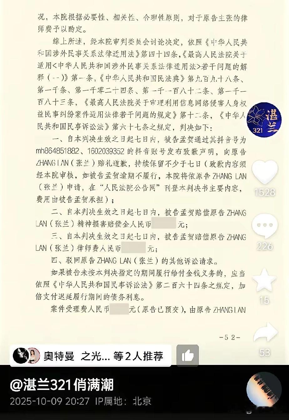 现在总算明白 为啥孟某贺一直为S家发声了 果真应了那句话 不是一家人不进一家门呀 看到张兰和汪小菲晒出的判决书 虽然不知道孟某贺到底要陪他们多少 但有一点很肯定 孟某贺输了 还要在网络上公开道歉 咱就说当初拿回了760w 人家母子俩也没赖着不给 拿到手见好就收就好了 还一个劲儿的兴风作浪 这跟当年大S前脚跟汪签完离婚协议 后脚就全网广而告之的娶光头进门 有啥不同 都是明明已经拿到了自己该得的 还不知足 贪心不足蛇吞象的加倍拿捏对方 好像当对方是个“泥人”一样 这下好了 对方不蒸馒头争口气 S家已经树倒猕猴散 孟某贺的明天在哪里