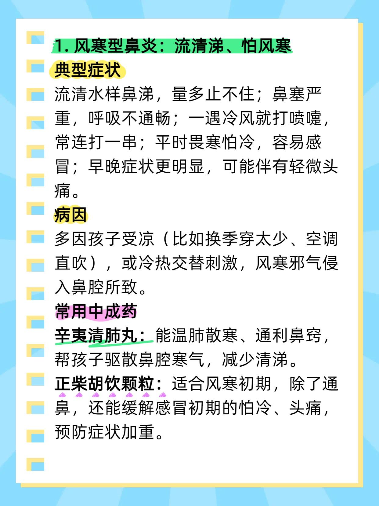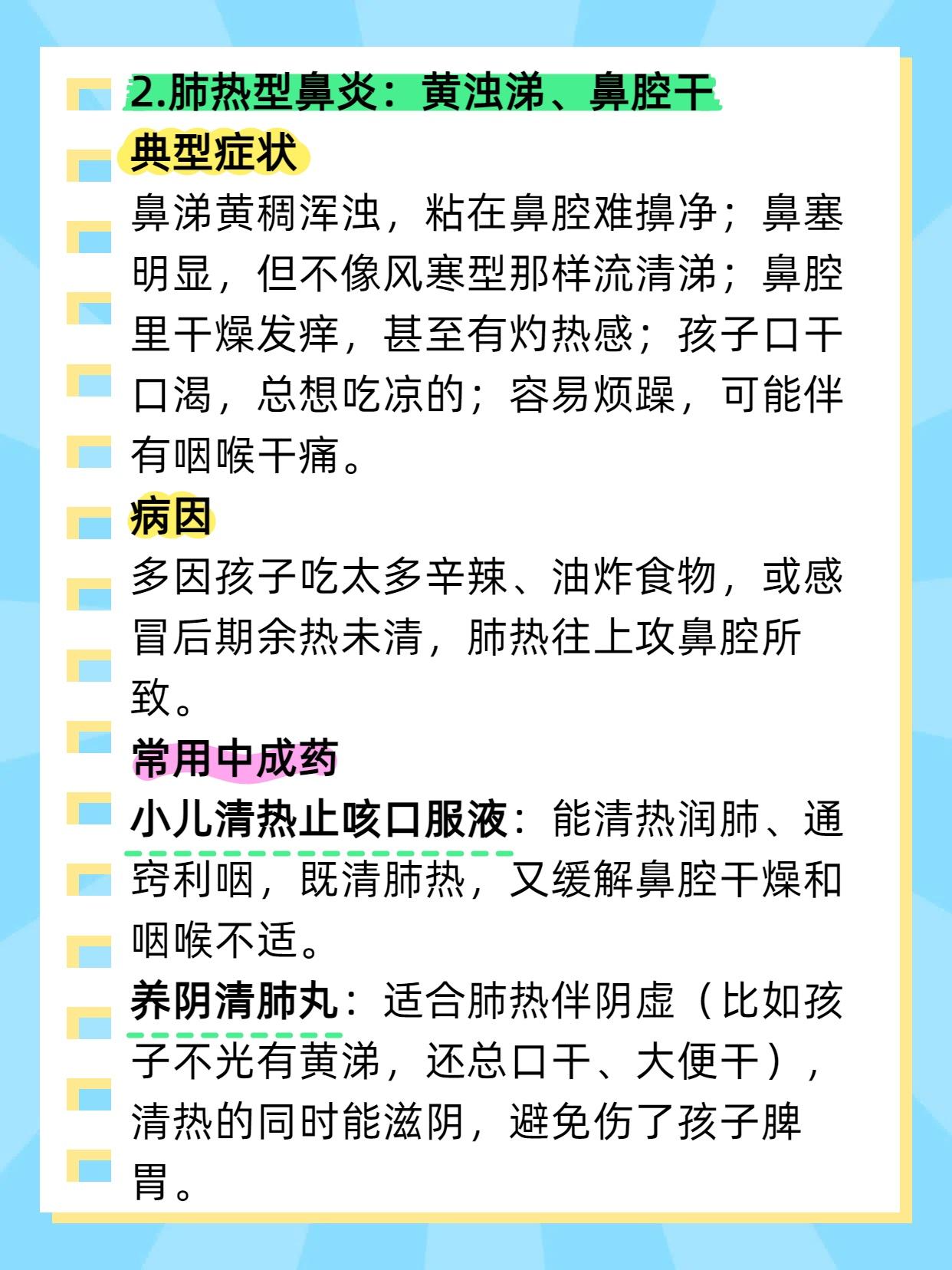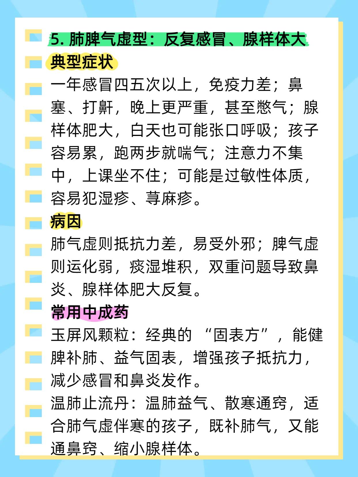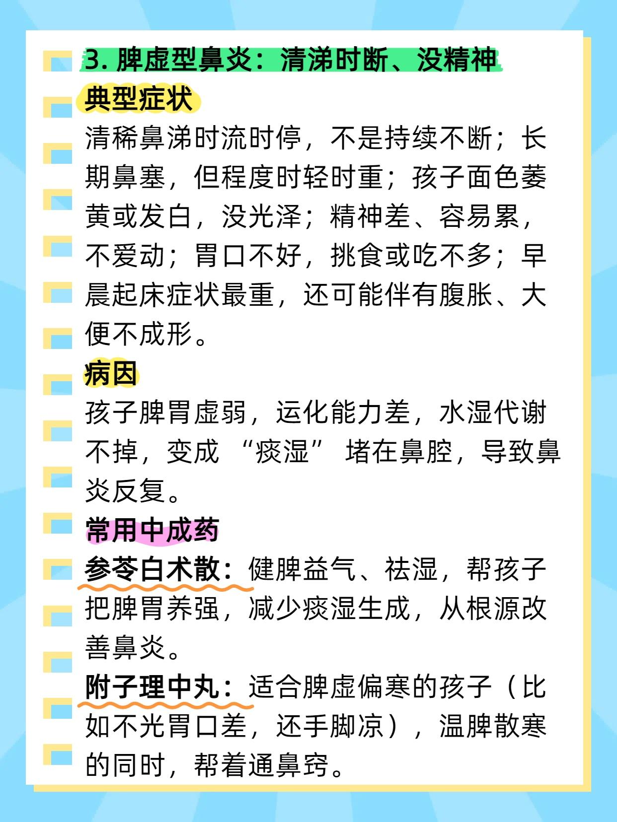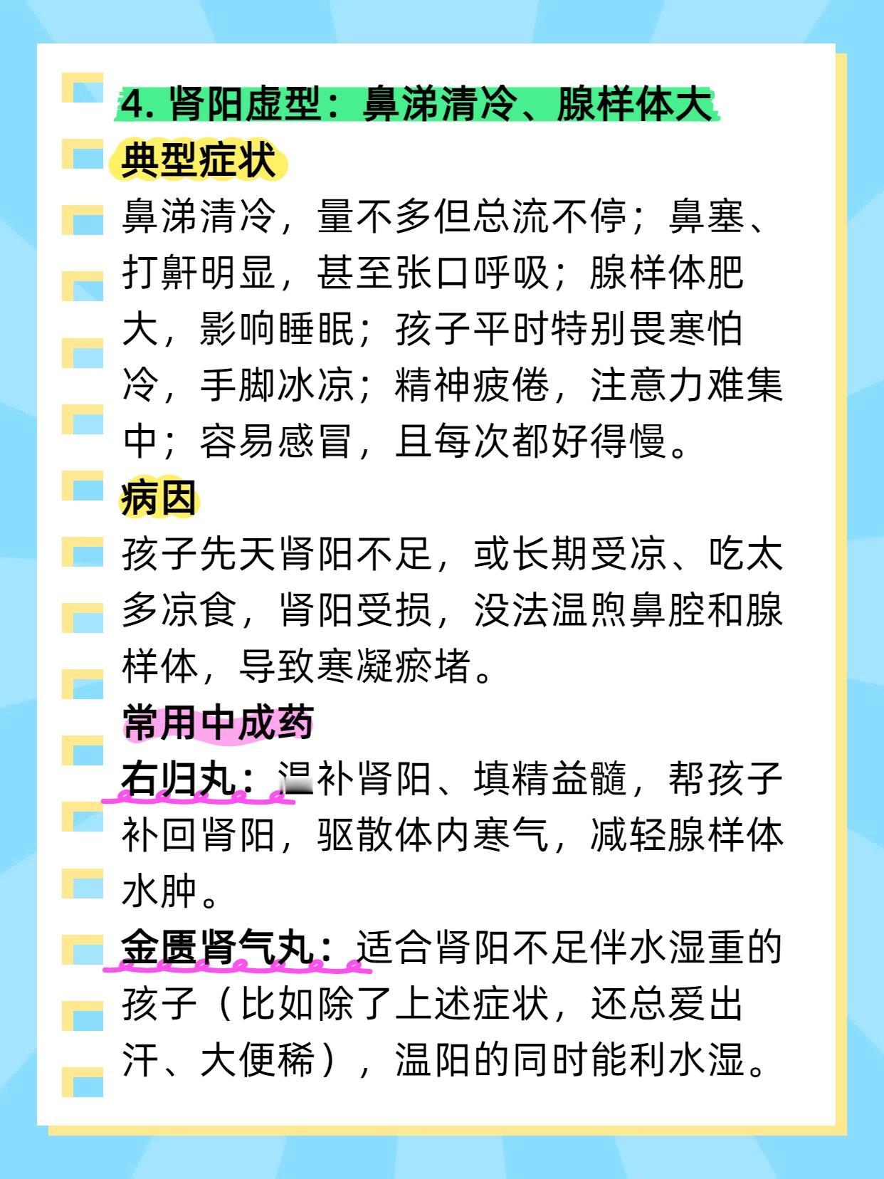 5个中成药,儿科医生不会轻易告诉你,怕你好的太快!堪称鼻炎、腺样体肥大的“死敌”! 家长们总为孩子鼻炎、腺样体肥大发愁:今天用抗生素,明天试激素,进口药也买了,可症状还是反复。其实不用这么折腾,适合孩子的 “调理良方” 就在身边 ——5 种中成药,针对不同症型,温和不伤身,用对了比进口药还管用。今天就按症型拆解,家长们可以对照参考。 1. 风寒型鼻炎:流清涕、怕风寒 辛夷清肺丸:能温肺散寒、通利鼻窍,帮孩子驱散鼻腔寒气,减少清涕。 正柴胡饮颗粒:适合风寒初期,除了通鼻,还能缓解感冒初期的怕冷、头痛,预防症状加重。 2. 肺热型鼻炎:黄浊涕、鼻腔干 小儿清热止咳口服液:能清热润肺、通窍利咽,既清肺热,又缓解鼻腔干燥和咽喉不适。 养阴清肺丸:适合肺热伴阴虚(比如孩子不光有黄涕,还总口干、大便干),清热的同时能滋阴,避免伤了孩子脾胃。 3. 脾虚型鼻炎:清涕时断、没精神 参苓白术散:健脾益气、祛湿,帮孩子把脾胃养强,减少痰湿生成,从根源改善鼻炎。 附子理中丸:适合脾虚偏寒的孩子(比如不光胃口差,还手脚凉),温脾散寒的同时,帮着通鼻窍。 4. 肾阳虚型:鼻涕清冷、腺样体大 右归丸:温补肾阳、填精益髓,帮孩子补回肾阳,驱散体内寒气,减轻腺样体水肿。 金匮肾气丸:适合肾阳不足伴水湿重的孩子(比如除了上述症状,还总爱出汗、大便稀),温阳的同时能利水湿。 5. 肺脾气虚型:反复感冒、腺样体大 玉屏风颗粒:经典的 “固表方”,能健脾补肺、益气固表,增强孩子抵抗力,减少感冒和鼻炎发作。 温肺止流丹:温肺益气、散寒通窍,适合肺气虚伴寒的孩子,既补肺气,又能通鼻窍、缩小腺样体。