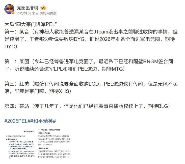 第二:某团(今年已经筹备进军电竞圈了,最近私下已经和隔壁RNGM签合同了,听说陆续还会进军LPL和咱们PEL这边,期待MTG)