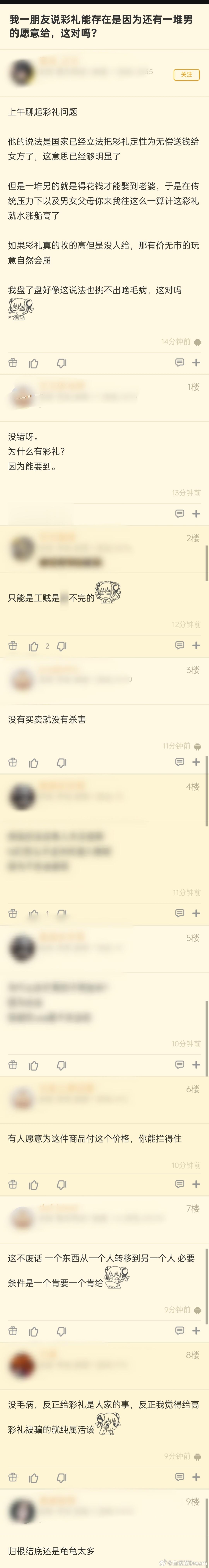 不烦汉服体验店 3 2025-10-12 18:49 这个东西就和动物打架争抢雌性一样 斗争就是必然的 那些呼吁不给彩礼的肯定是憨憨 你没有竞争力就被淘汰 想让公权力来管这种事的也都是些心大的人 momo 回复 10-12 21:46 是的,没有彩礼也会有其他竞争方式,彩礼这个方式都争不过别人,其他更争不过,,很多人还没到谈彩礼这一步已经被淘汰了