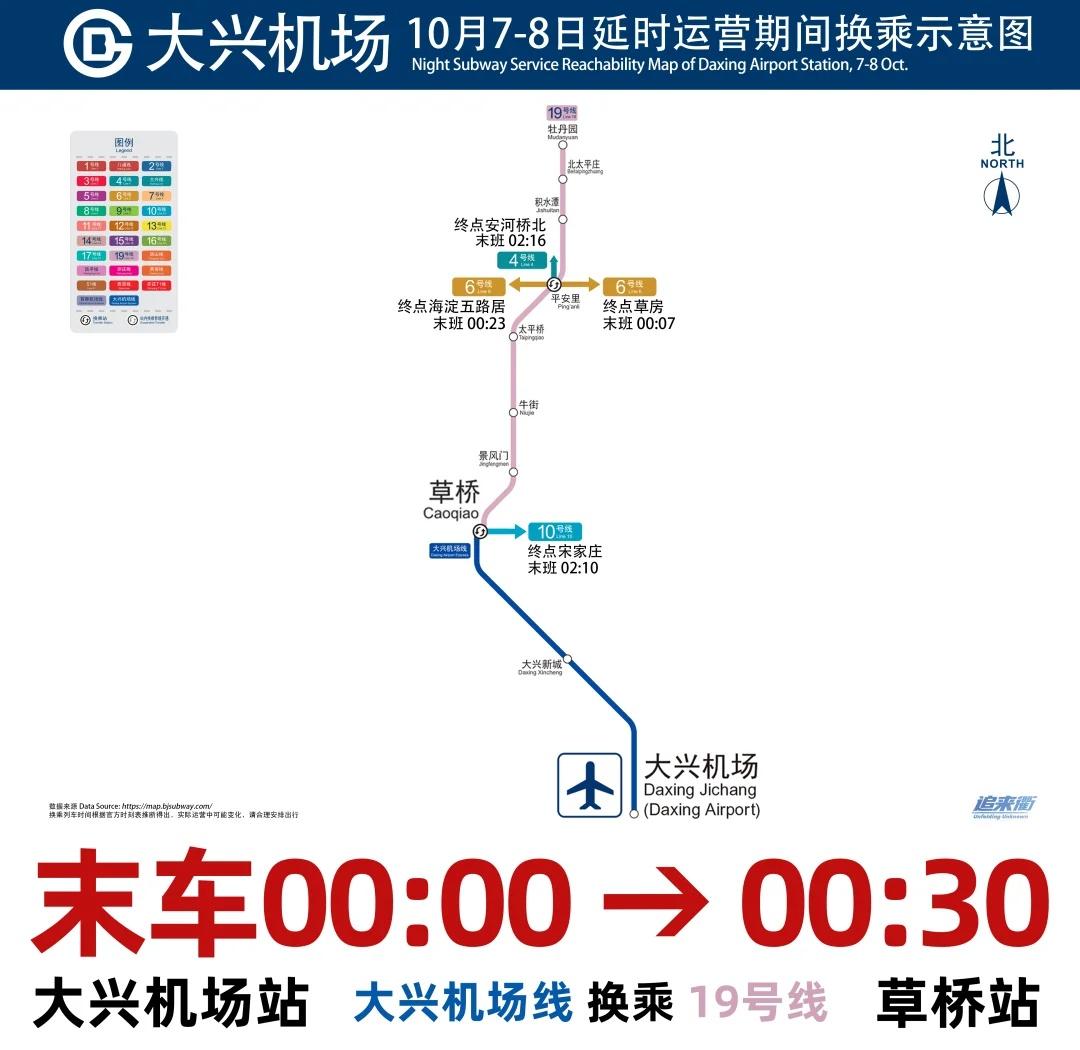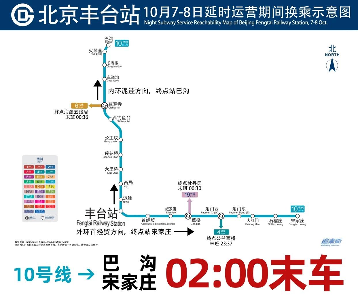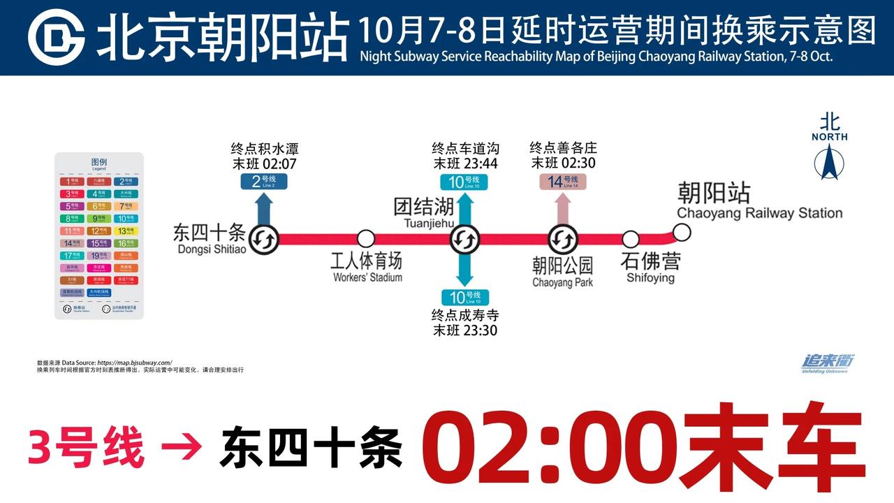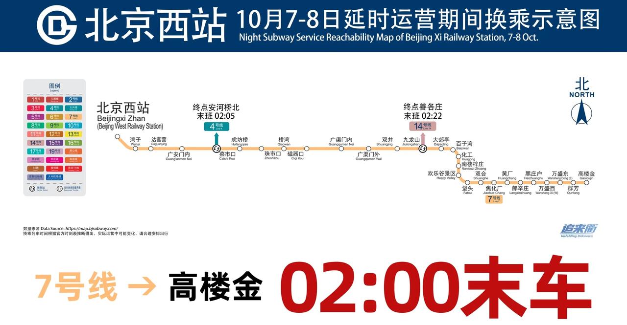 北京地铁深夜延时运营图解:十一节后版 节后返京高峰日,北京地铁将再度针对各大车站、机场展开不同线路间可换乘的「组网」延时运营。本次的亮点是:北京北站和地铁西直门站也加入了延时的行列。 从各车站、机场出发,延时期间能赶上哪里的换乘呢?针对节后7-8日的情况,我们做了几张示意图供你参考。 北京南站:图1 地铁4、14号线末车时间均为次日2:00。两条线路都能赶上不少其他线路的换乘。特别是在6号线平安里、金台路和7号线九龙山的加持下,通过一次换乘即可到达西至海淀五路居,东抵环球度假区周边的广大区域。 北京西站:图2 地铁7号线延时至次日2:00,终点站高楼金。延时期间的多数车次可在菜市口换乘4号线往安河桥北(北行)、14号线往善各庄(北行)的列车。由于它俩的通达范围相当广阔,换入后可通过二次换乘去往2、6、19等线路沿线。 北京站:图3 地铁2号线内外环双方向末车次日2:00发出。途经东、北侧的外环列车终点积水潭。如抵达时间较早,还可换上1、6号线向东行进。途经南、西侧的内环列车终点西直门,多数车次可换乘4号线安河桥北方向的延时列车。 北京北站:图4 地铁2号线外环方向末车时间为次日1:39,外环方向无车。值得注意的是,这趟车行驶至北京站的时间刚好为2:00,延时期间的每班外环列车都能够服务两个铁路车站。 北京朝阳站:图5 地铁3号线东四十条方向末车时间为次日2:00。本站出发的通达度相对较低,仅可在朝阳公园站换乘14号线向北,或在东四十条站换乘2号线外环向北行进,最多从积水潭再换一次19号线,还是向北,坐到牡丹园。 北京丰台站:图6 地铁10号线内外环双方向末车时间为次日2:00。北行的内环方向常规末车时间较晚,如果能赶上的话,则有机会换到14、1、6三条线路向西行驶的末车。东行的外环方向常规末车较早,本线延时+草桥站19号线延时大幅拓展了东北方向的通达面。 大兴机场:图7 一如既往,大兴机场线将与19号线联动延时,大兴机场站往草桥末车00:00,19号线草桥往牡丹园末车00:30。得益于10号线外环方向配合丰台站延时至次日2:00,草桥站的三线换乘功能应可保持至0:30左右。 轨道交通 北京 地铁 地铁延时 北京南站 北京西站