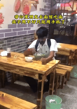 印度人吃面条用手抓?这画面真是太搞笑了[偷笑]。一位中国人带印度朋友去吃面,而这