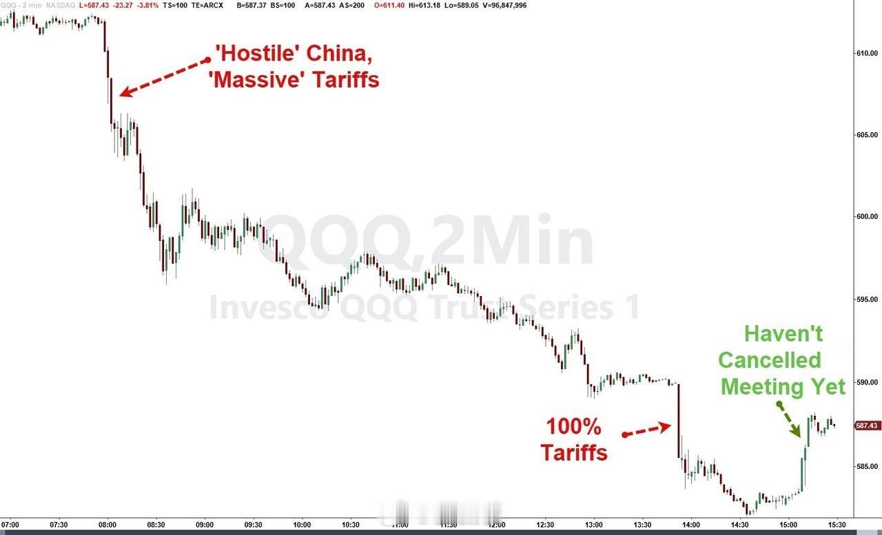 不得不说华尔街这帮资本家真是把特朗普的套路摸得透透的!美东时间周五先是上演 “黑色星期五”,道指跌 1.9%,标普砸 2.71%,纳指直接暴跌 3.56%,创下 4 月以来最惨单日跌幅,ARM 跌超 9%,高通、超威半导体暴跌。可刚刚过去一天盘后就直线反弹,明眼人一看就懂 —— 特朗普喊的 “对华加税 100%” 纯属诈唬,根本没法真干!