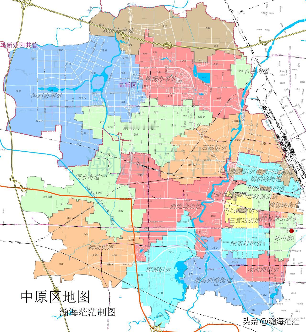 郑州市中原区简图 。 里面有郑州市中原区乡镇街道村庄边界,河流,湖泊,公路,国道,高速,铁路,地铁。 另外附上高新区边界。