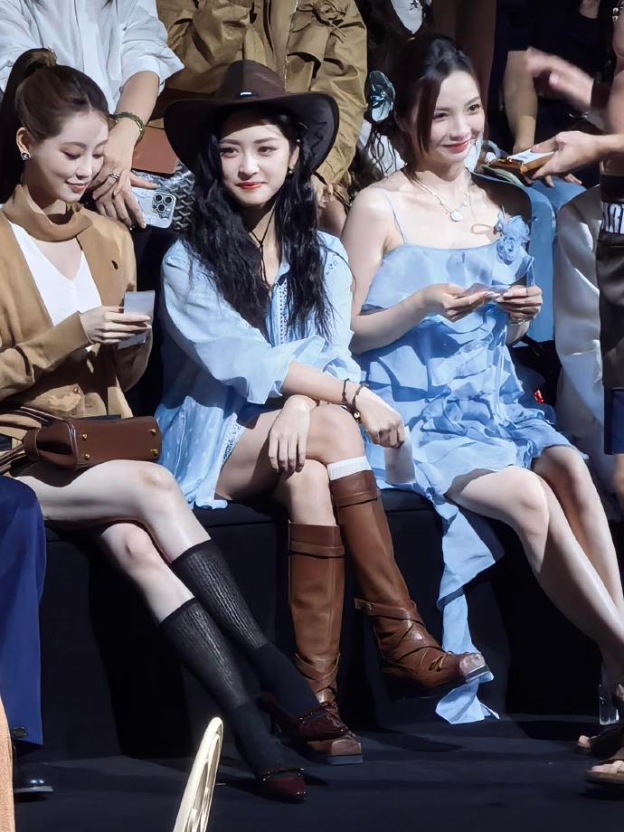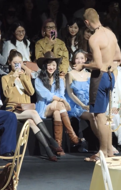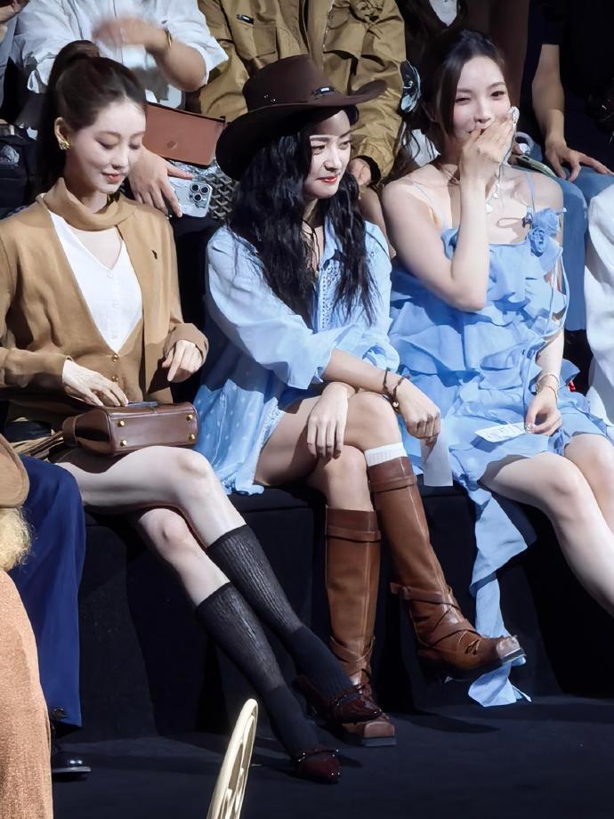 沈月害羞,沈月牛仔风看秀造型,咱就说这个沈月看到男模这个害羞劲,谁懂啊完全不敢正眼看,一整个有被这个反应可爱到啦~