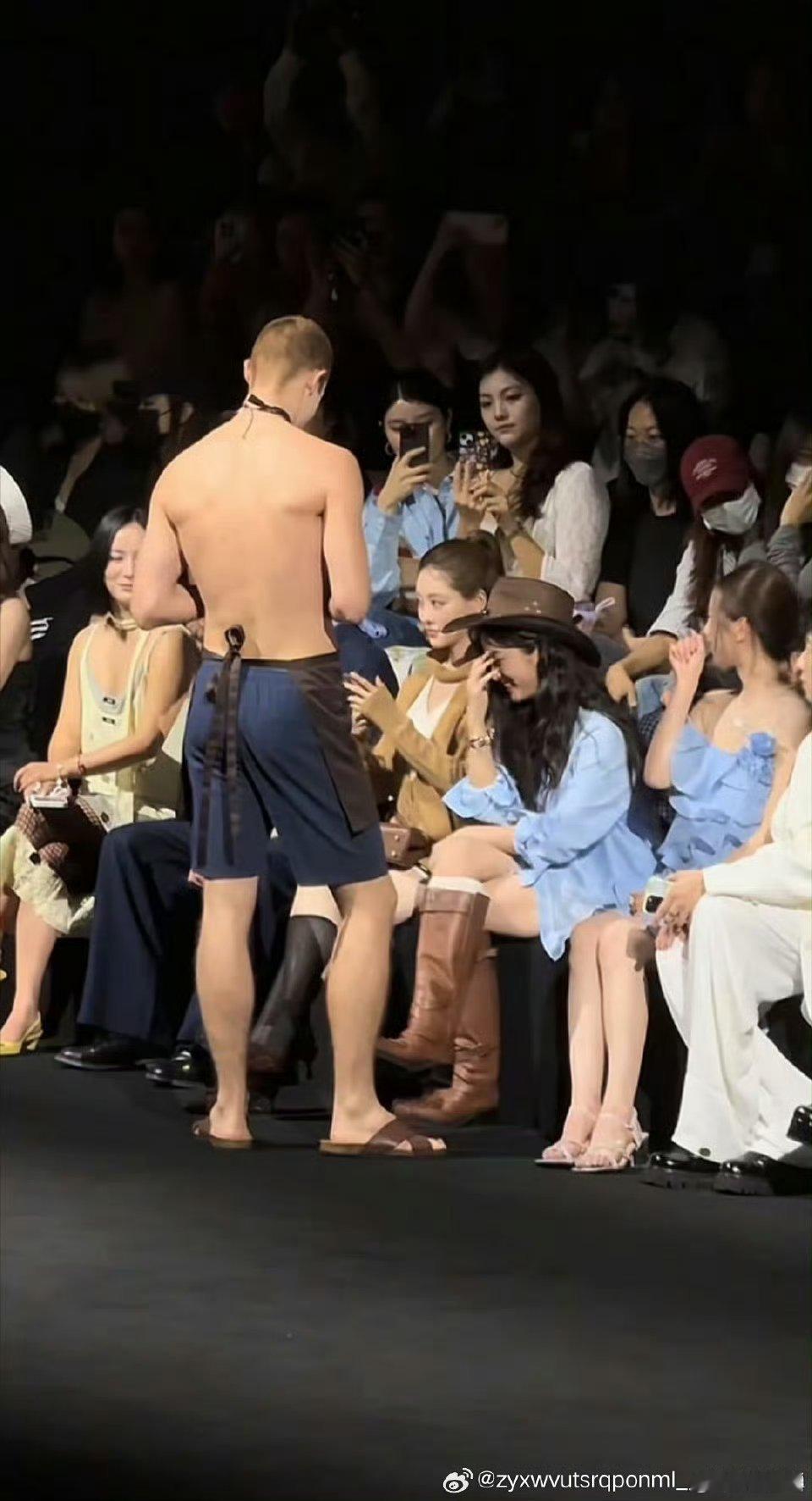 10月12日,在上海时装周上看秀,看到半裸男模走近,她先是瞳孔地震,非常震惊😱,随后是害羞😳,迅速低头紧盯自己的膝盖,手指不停拧着衣角和裙摆,还用手遮住眼睛👀,耳根至脖颈泛红,眼神一直在躲避男模,她甚至脱口而出:“快给我眼睛👀找个地儿”。