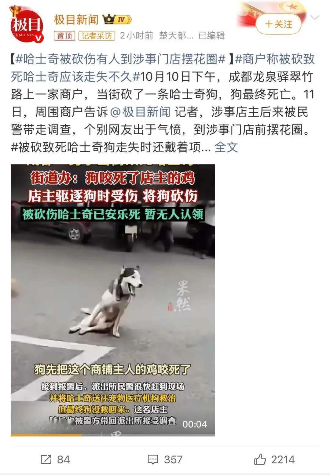 还记得几个月前的一个新闻吗?一个饭店老板捶死了一只从家里溜出来未拴绳的金毛。这事儿就炸了!有人说老板不知道是不是流浪狗,为了保护顾客,老板没错。有人说老板心太狠,不给吃的,赶出去就算了。双方连续对喷了一个星期...那时我也发过一篇,我是顶后者观点的,觉得赶出去就行了,评论区给我也喷够呛。 这种事又发生了,这次我仅以我知道的情况来说,我不发表任何观点。对与错,每个人的立场不同,想喷在评论区里找个对立面随便喷,别喷我了! 视频里哈士奇浑身是血瘫在地上,店主拎着刀站在旁边,反正第一现场搁谁看都觉得是在虐狗泄愤!但官方通报一出,剧情彻底反转!这狗是流浪的,先闯进店铺咬死了店主养的鸡,扑上去撕咬时还把店主手臂抓伤了。店主一气之下动了刀,狗最终因伤重被安乐死。但有人说店主根本没有鸡,就是虐待狂杀狗… 相同的剧情又来了,爱狗网友人肉店主,电话轰炸,甚至往店门口摆花圈。 提问时间:城市里为啥会有流浪狗?哈士奇!名犬!肯定是被弃养的。店主自卫是否过激?网络审判到底想维护什么? 再往下不说了!可以开喷了!