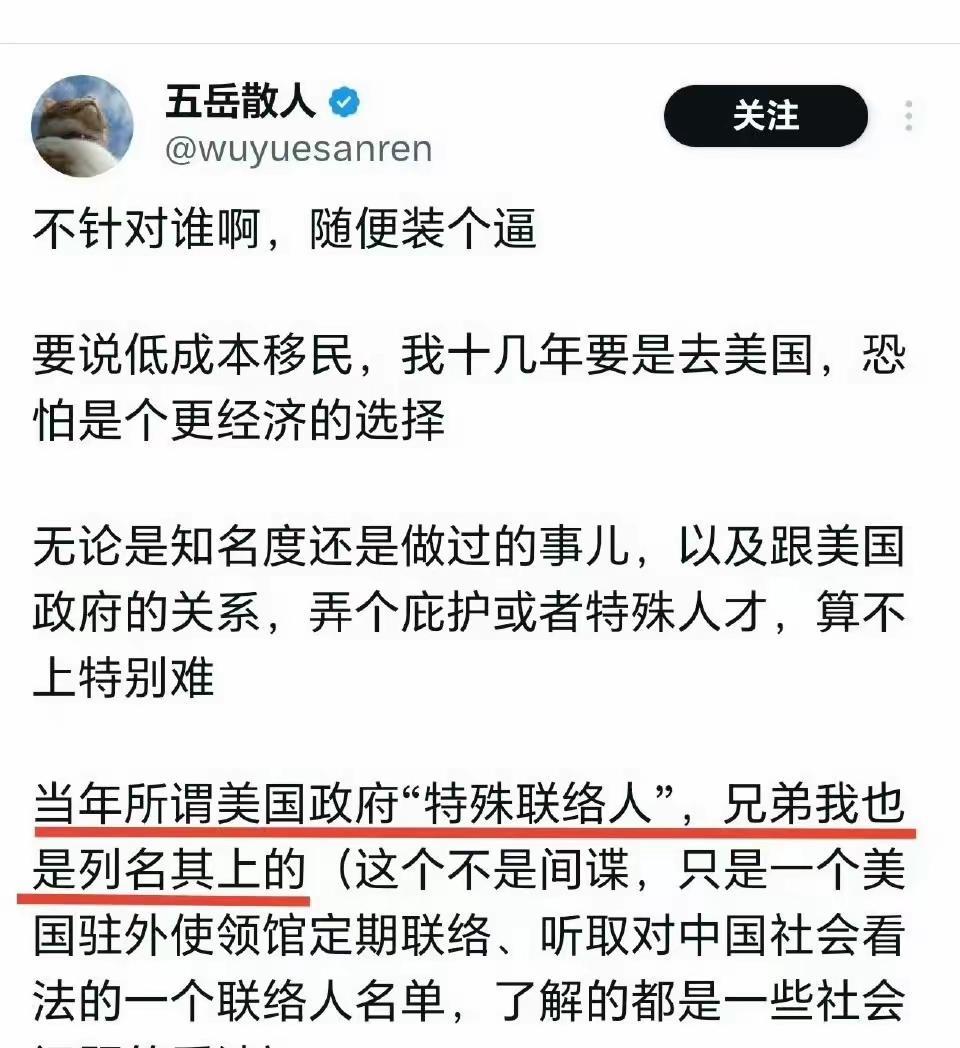 这个特别能装逼的“五岳散人”,又跳出来装逼了。 这次,他特别强调了一下:他不是间谍,而是“美国政府的特殊联络人”。 [捂脸][不看][泪奔]