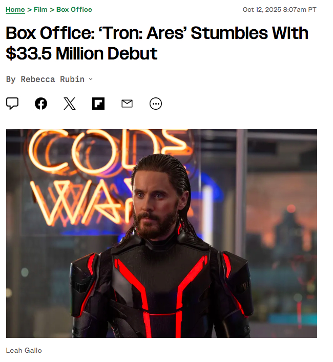 TNABO 《创:战神》北美开画报3350万美元周末票房,不敌2010年《创:战纪》在圣诞前一周收获的4403万美元开局,也低于杰瑞德·莱托先前出演的《莫比亚斯》其3950万美元首周末三日表现。影片全球开画报6000万美元,只差中国内地下周末开映。