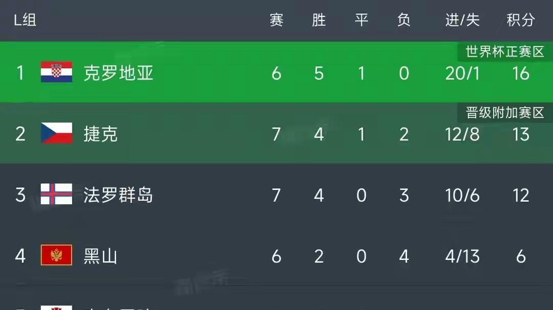 克罗地亚3:0直布罗陀,基本锁定世界杯席位,苏西奇破门得分,这位国米中场越来越好,已经可以让魔笛稍微歇一歇了,也算是克罗地亚未来的中场接班人了,同组捷克爆冷1:2法罗群岛,也让少赛一场的克罗地亚不仅领先三分,还拥有15个净胜球的优势,可以说克罗地亚理论上已经晋级世界杯,而捷克还需要和法罗群岛争夺附加赛资格,这一场失利让对手看到了机会,最后一轮他们必须赢球才能去踢附加赛![作揖][作揖]