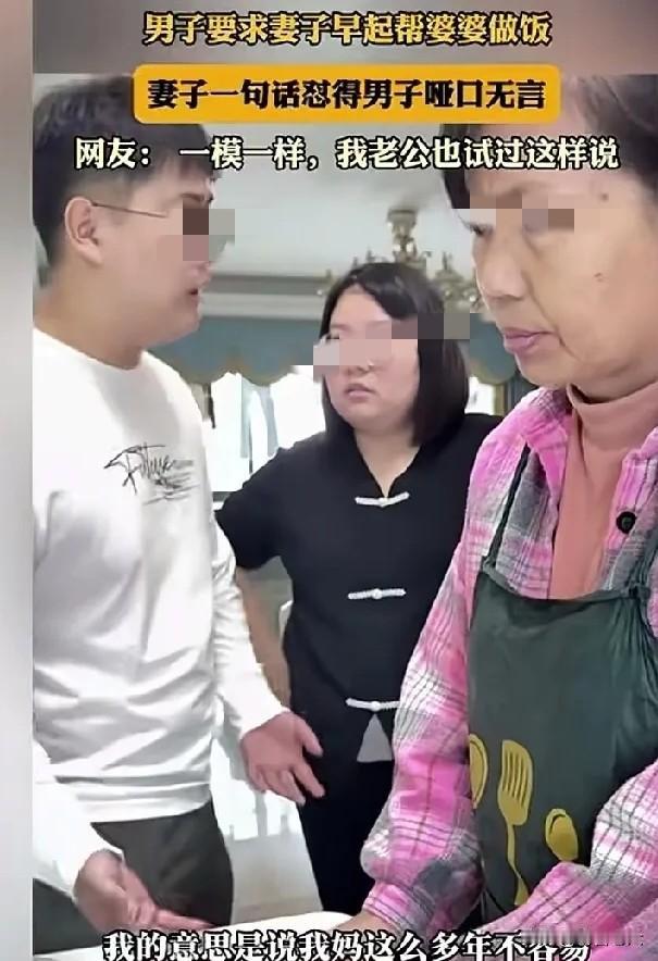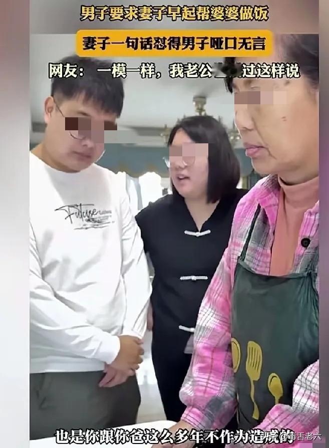 男人一结婚就孝顺了!男子要求老婆早点起床帮婆婆做饭,他觉得老妈一个人做饭太不容易了。老婆问,你咋不做饭呢?男子两双一摊:我不会做饭。老婆又问,你爸咋不做饭呢?男子理直气壮:我爸也不会啊! 这事儿听着是不是特扎心?表面看是小两口拌嘴,里头藏着老一套的双标戏码。 男的自己不愿动手,倒把“孝顺”变成妻子的KPI——妈一个人做饭辛苦,怎么不说是咱俩当小辈的该搭把手? 问他为啥不做,一句“我不会”就想甩锅,可“不会”是天生的吗?从小到大没人教,还是自己压根没学? 更绝的是拿爹当挡箭牌,他爸不做饭就能证明儿媳该做?合着这家里的老规矩就是“女人天生该围着厨房转”? 现在年轻人结婚,谁不想好好过日子?可孝顺从来不是单方面的要求。真疼老人,自己先动起来,哪怕从端碗盛饭学起;想让妻子体谅,总得拿出同等的诚意。 拿“我不会”“我爸也不做”当借口,本质是把传统里的性别分工当尚方宝剑,只享受“被照顾”的便利,不想担“共同付出”的责任。 各位读者你们怎么看?欢迎在评论区讨论。
