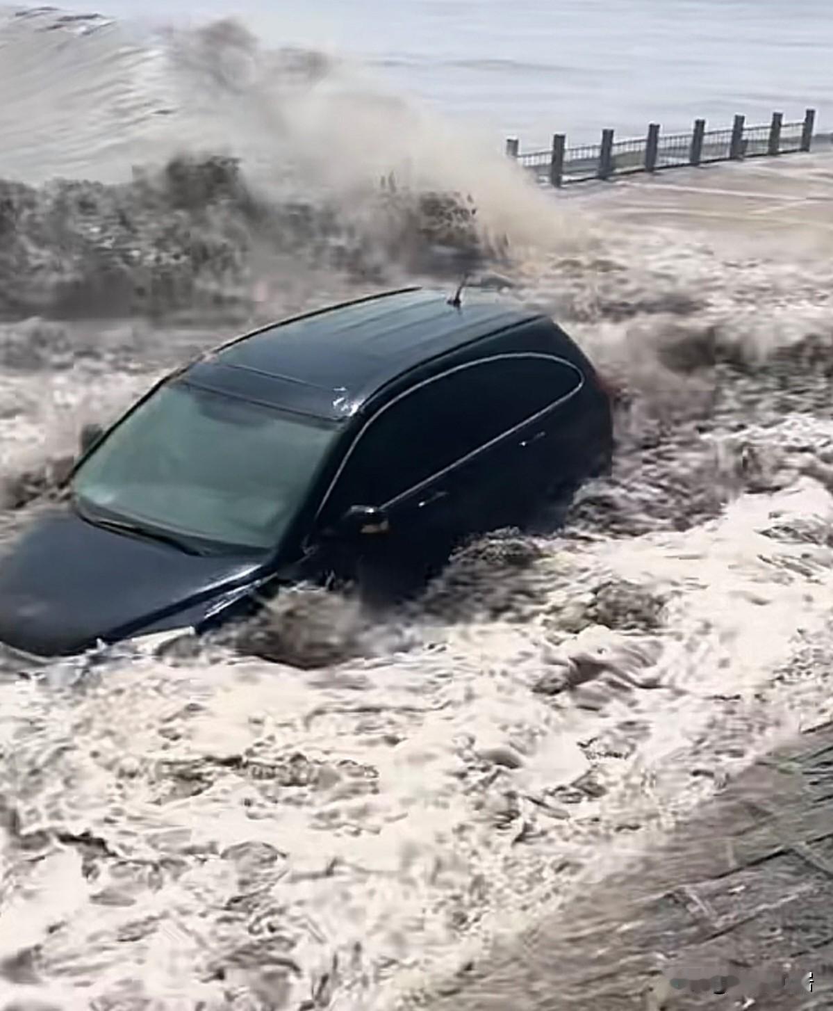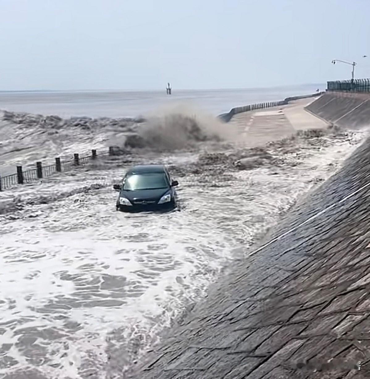 观潮时,还是得听劝。涨潮的时候,不要站在堤坝上,等候潮水的来临。你看这辆几吨重的车,在汹涌的潮水下,也被冲刷的像小船一样晃荡。 更不用说,站在防护堤上的人了。所以千万不要为了体验潮水汹涌的感觉,或者为了拍一段视频。而去亲自迎接潮水的冲击。更不要在快涨潮的时候,把车子开到防护堤上。