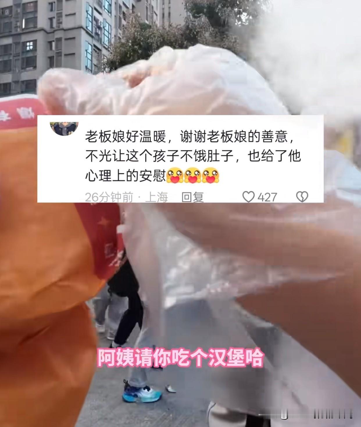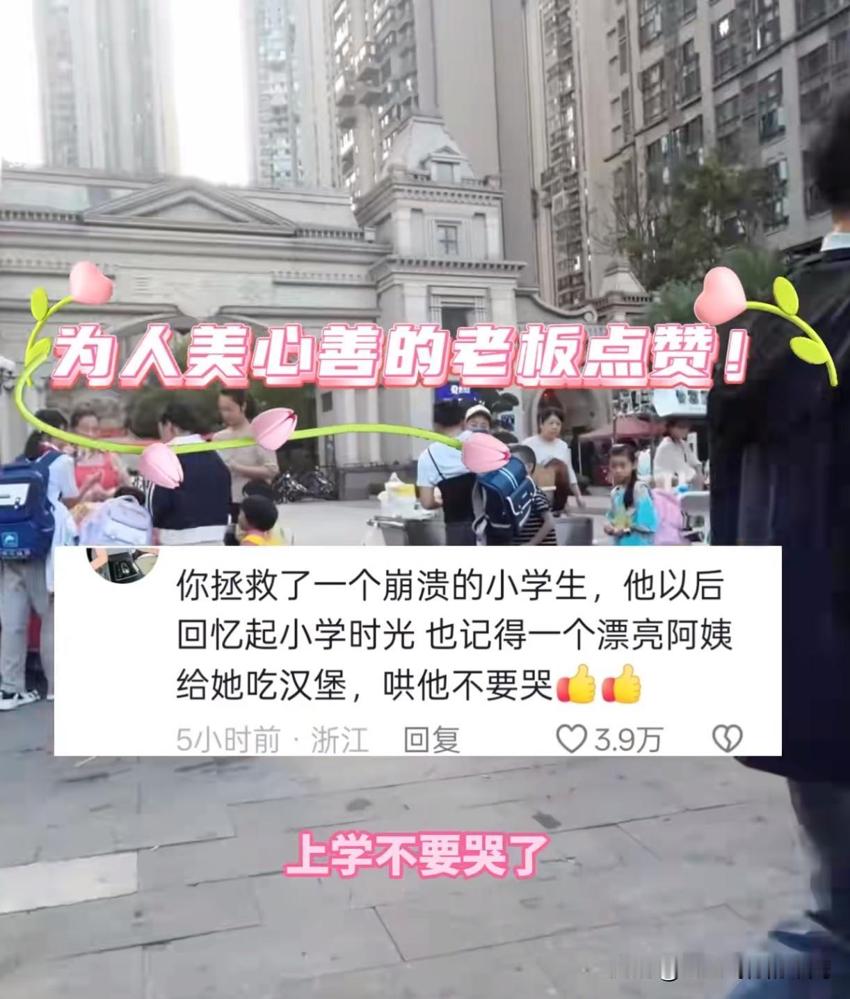 “为人美心善的老板娘点赞!”贵阳一所学校门口,有个男孩买早餐时被路人撞倒,早饭全洒在地上。更让人生气的是,撞人的人不但不道歉,还骂了孩子。卖汉堡的阿姨看到后,马上免费给了男孩一个汉堡,还温柔安慰他。 阿姨那句“宝贝,阿姨请你吃”特别暖心,一下子就让男孩不难过了。说实话,这份善意不只是填饱了肚子,更是保护了孩子心里的温暖。 我觉得,大人随便凶一个孩子,真的会让他留下阴影。而像阿姨这样的陌生人给的温暖,恰恰是最好的安慰。她的汉堡摊就像这座城市里的小小暖心站,用行动证明了“好人有好报”这个简单的道理。 这个世界有时确实会让人失望,但总有人在默默为你点一盏灯。这份随手给出的善意提醒着我们:再小的温暖也值得被珍惜。