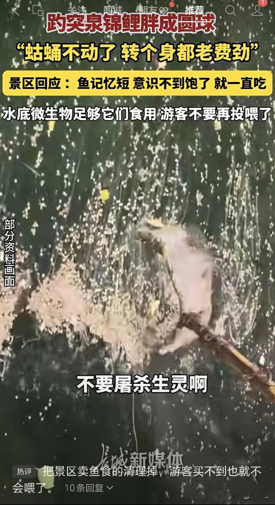 趵突泉锦鲤胖成球,景区挂出最耿直警告:“再喂就嘎了”!网友:这大概是史上最幸福的“工伤”。 山东济南趵突泉的锦鲤又上新闻了!因为它们现在胖的连隐藏技能“仰泳”都使出来了。 趵突泉的锦鲤因为珠圆玉润,被网友戏称为“猪鲤”。它们实实在在胖成了球,现在都“蛄蛹不动了,转个身都老费劲”! 甚至还出现了“仰泳”现象! 这可不是啥好事,养过鱼的都知道,这鱼翻白肚皮意味着什么。 景区介绍,泉水常年低温(18℃),促使锦鲤储备脂肪,且水中微生物丰富,生存环境安逸。而游客频繁投喂面包等食物,锦鲤因记忆短暂持续进食,导致过度肥胖。 景区的锦鲤据说已经被撑死好几条了!视频中工作人员一直在呼吁:不要再荼毒生灵啊! 网友也倍感委屈,把景区门口卖鱼食的先清理掉!本来没打算喂食,结果遇到卖鱼食的,一下没忍住。 你看看,为了这个宠儿锦鲤,景区和游客都费了大心了。 卖鱼食的需要清理,喂鱼行为也需要克制。 因为专家说了过度肥胖可能导致锦鲤失鳔(鱼鳔功能异常),危及健康。 咱再不控制自己无处安放的爱心,锦鲤宝宝们真有可能就噶了! 趵突泉的锦鲤宝宝们,可真是让全社会操碎了心!三秒的记忆,无忧无虑是挺好,不知道饥饱也确实愁人! 大家伙再去看锦鲤宝宝时,不要再喂食了,还是看着它们灵活地游来游去更加心生欢喜! 信息来源于长城新媒体,侵联删!